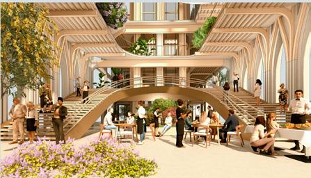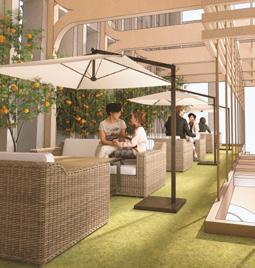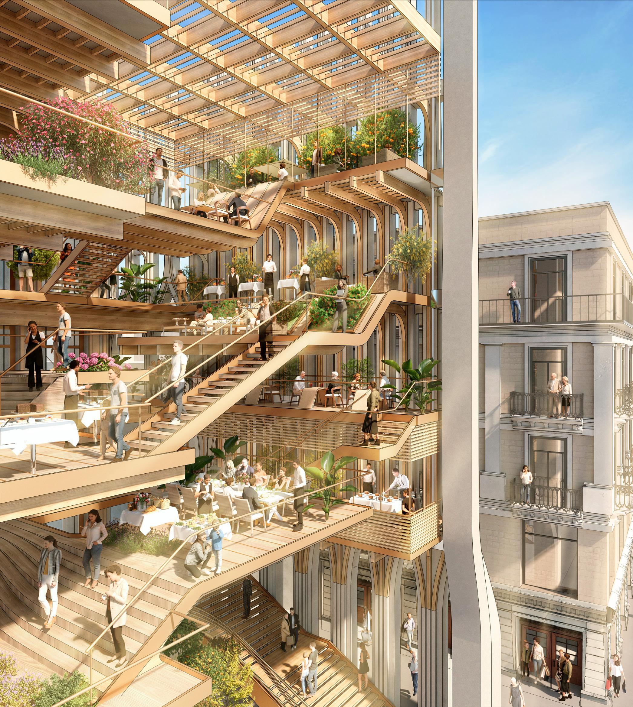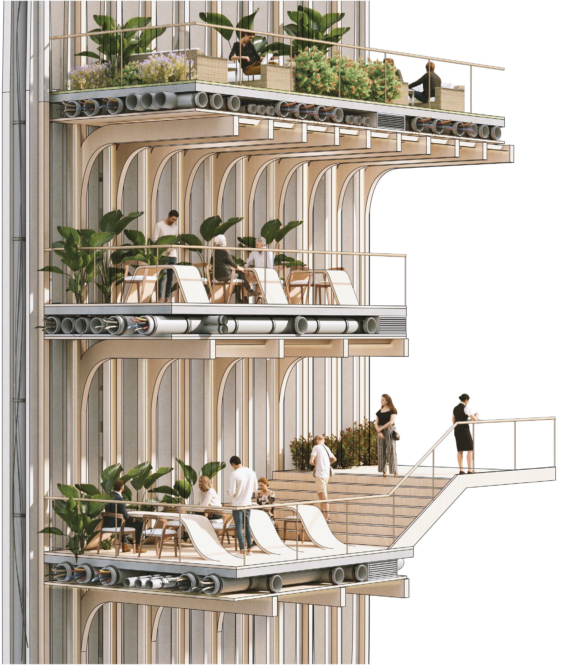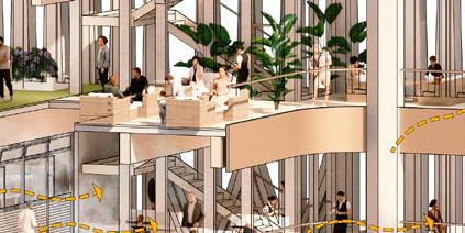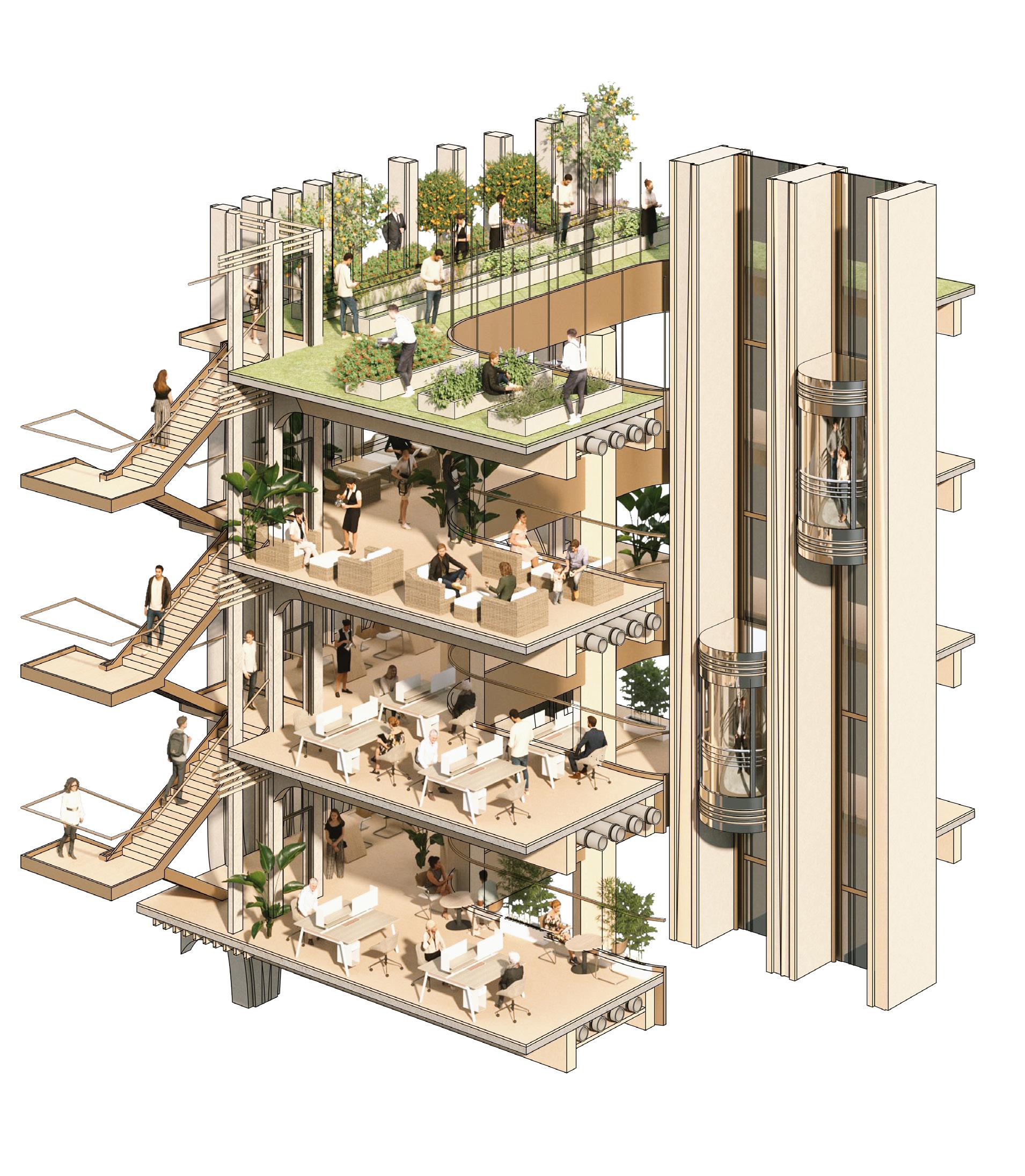 The lower level of the roof coincides with the front atrium’s top floor and is accessible to the public as a terraced eating space. It could be views as the final floor of the vertical garden.