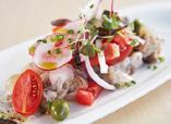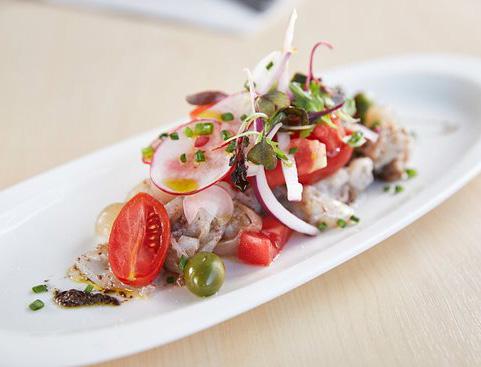 A Catalan favourite, “esqueixada” is a salad made with shredded salted cod, tomatoes, onions, extra-virgin olive oil and vinegar, garnished with a few black olives and watercress leaves.
