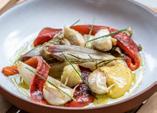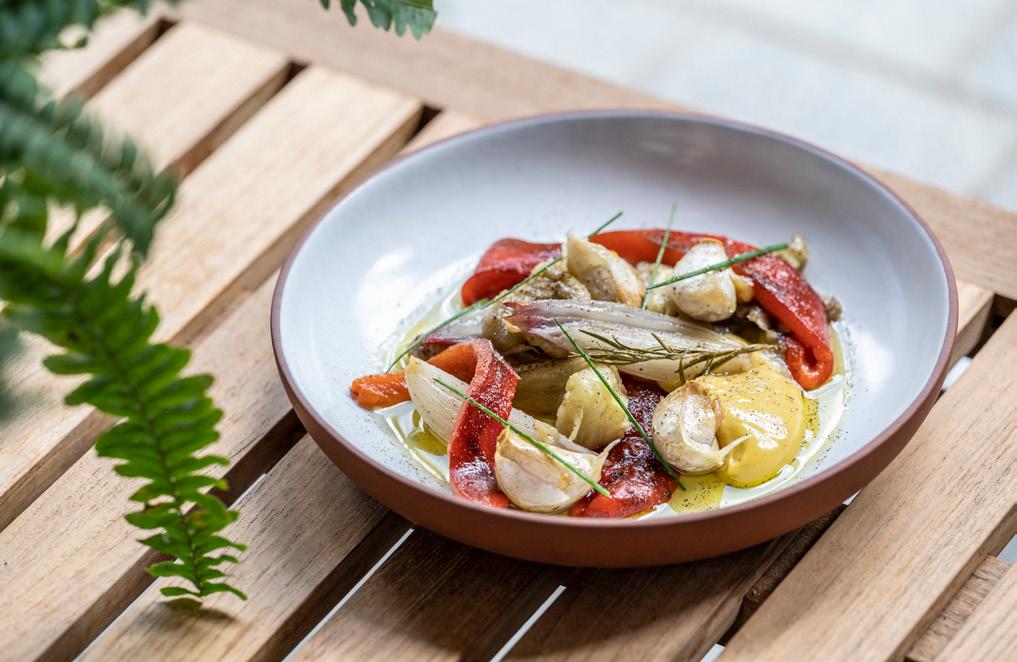 A very traditional Catalan “escalivada”, which consists of roasted seasonal vegetables, such as peppers, aubergines, artichokes and tomatoes, all organically grown in our seasonal gardens.