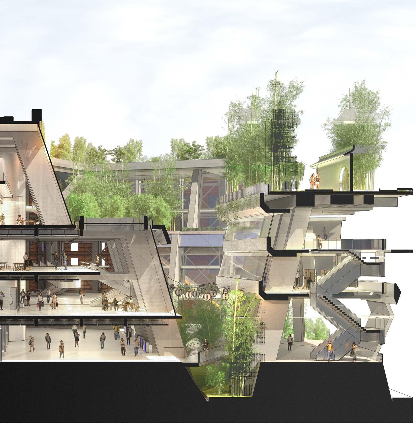 The outer retail ring aims to integrate several cultural topologies, revealing Inspired by the high density planning spaces of Chinese technology ring has two levels of retail at the lower levels, with large footprint at ground reduce traffic as we move upwards, following the privacy hierarchy at spaces.