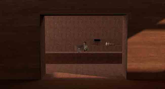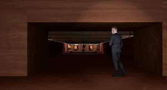 Studied for how the spaces within and around the sense walls may be occupied for private meetings, further negotiations and back of house. Lined with elements of local craft.