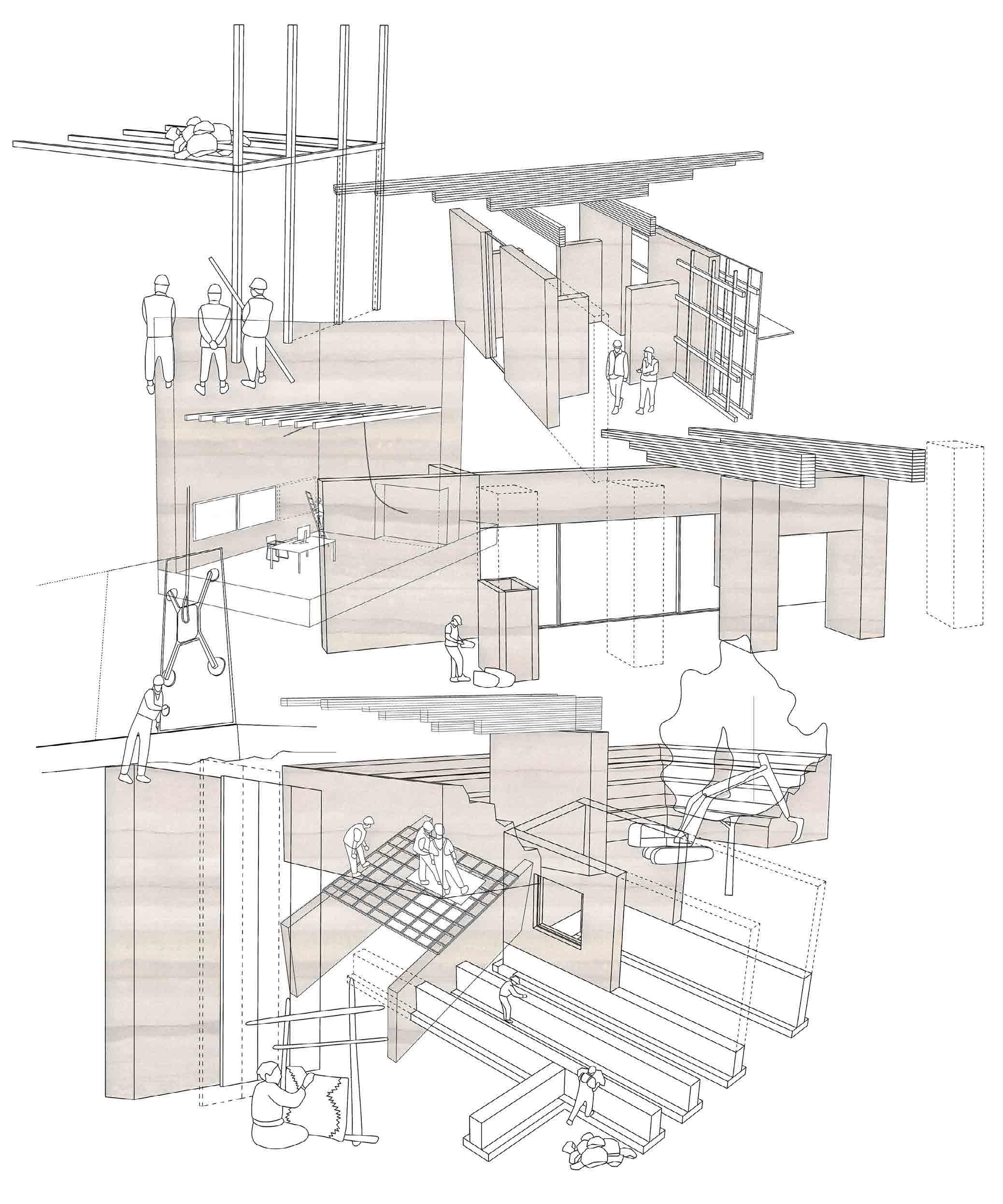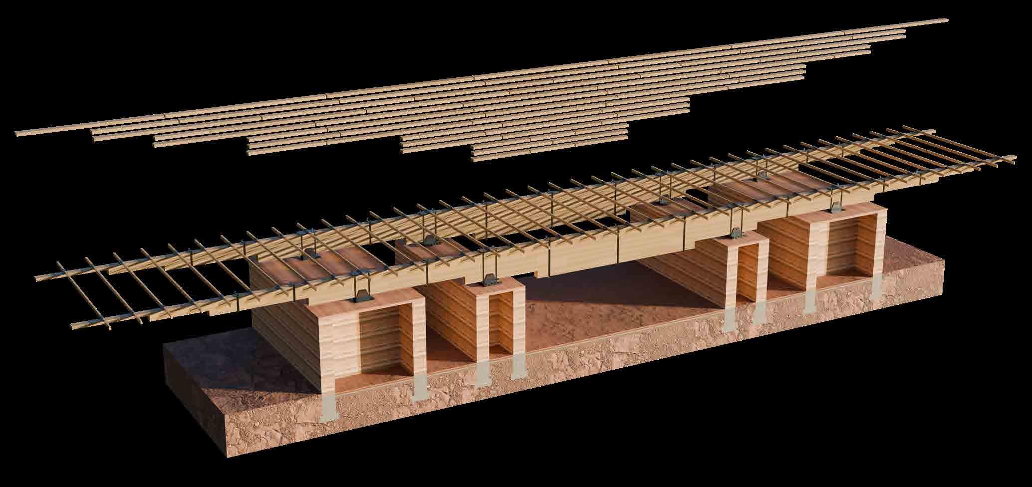 A concept drawing that considers the stacking and bundling of multiple timber vault structures to achieve a greater heights.