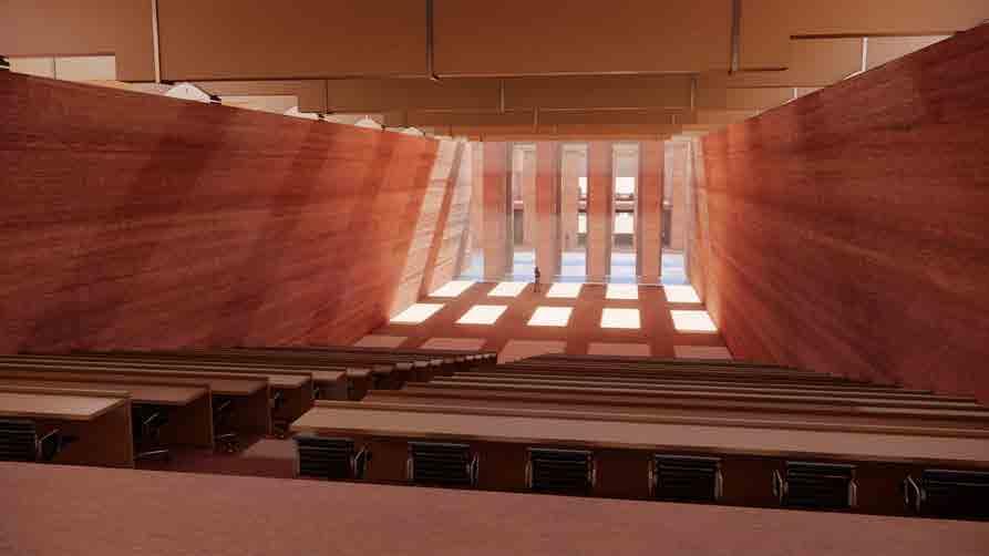 View from the stage of the auditorium as tribes gather for a conference. A dividing stream of water cools the hall, enhances acoustics and adds continuity to the outdoor space.