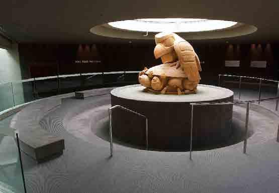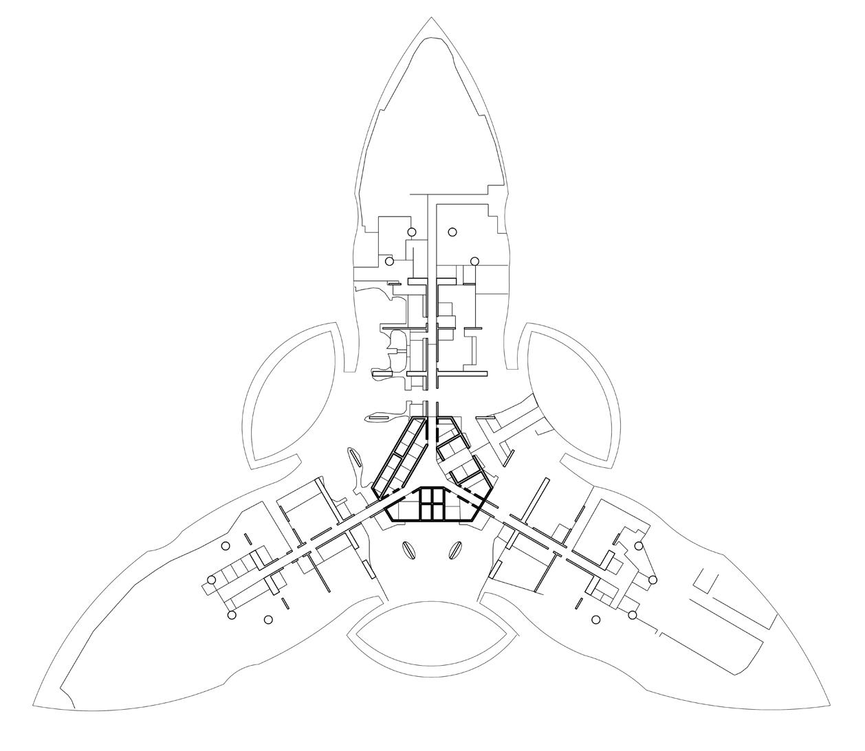 Section through the law firm, signing room, negotiation chamber and legislative chamber. The four central pilars representative of the four main tribes.