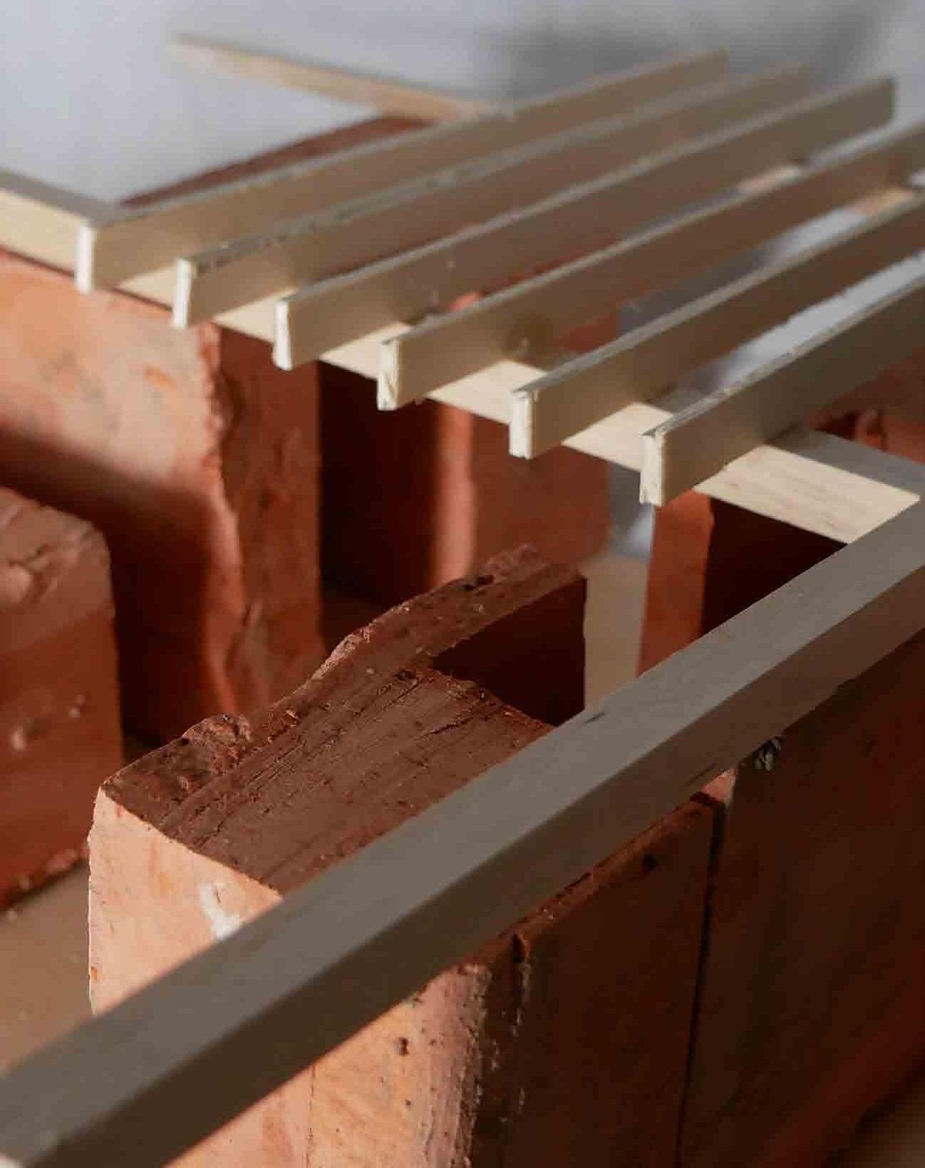 The timber posts are first erected, then the timber ribs which extrude from the same pier capital as the masonry arch.