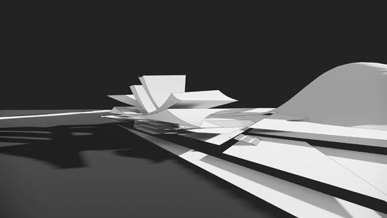A fragment of the south building around the main foyer atrium. This study describes the transition of space and lanscape, from water, to garden, to internal garden lobby, and back to garden in the main promenade that separates the two venues, creating a formal symmetry in the design landscape. The roof gradually sweeps upwards as it approaches the theatre’s flytower.