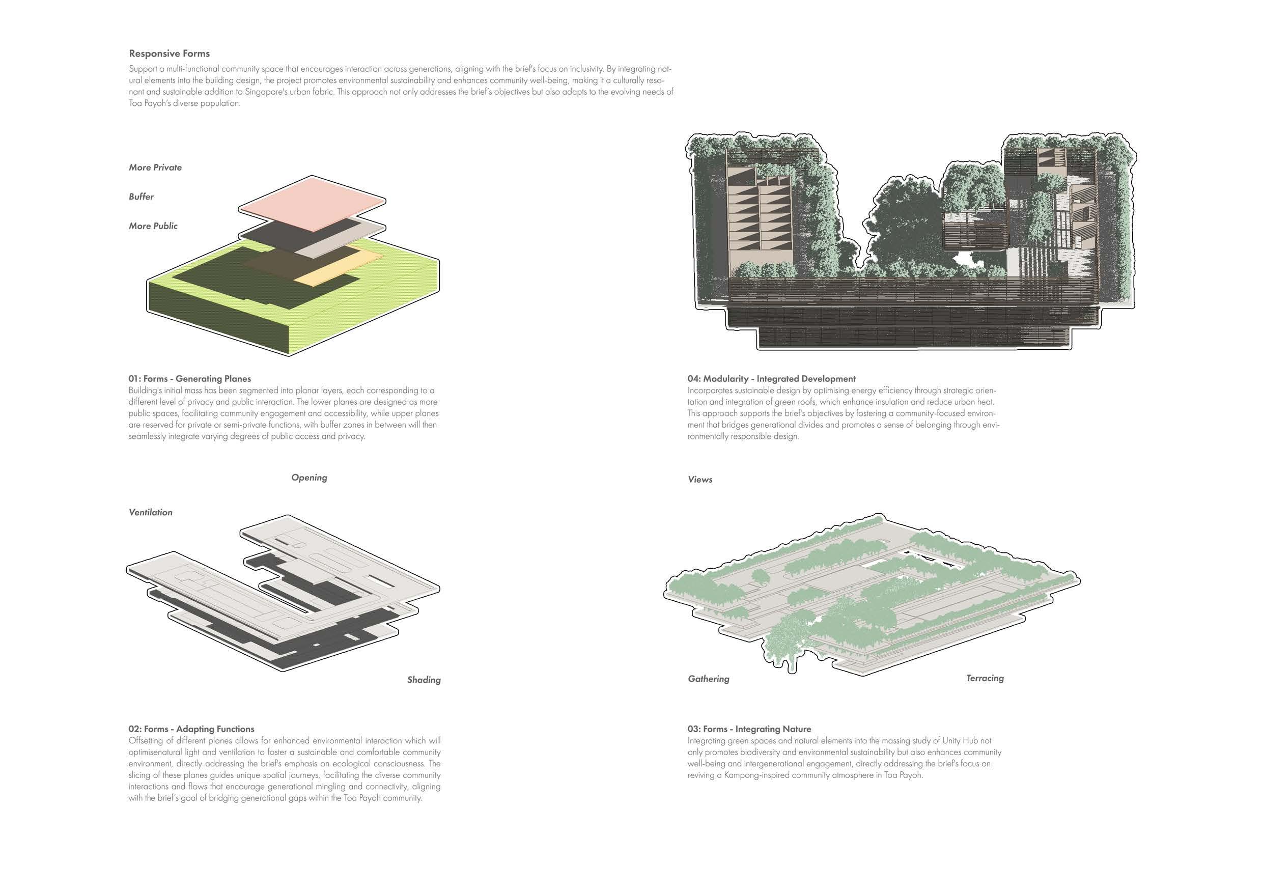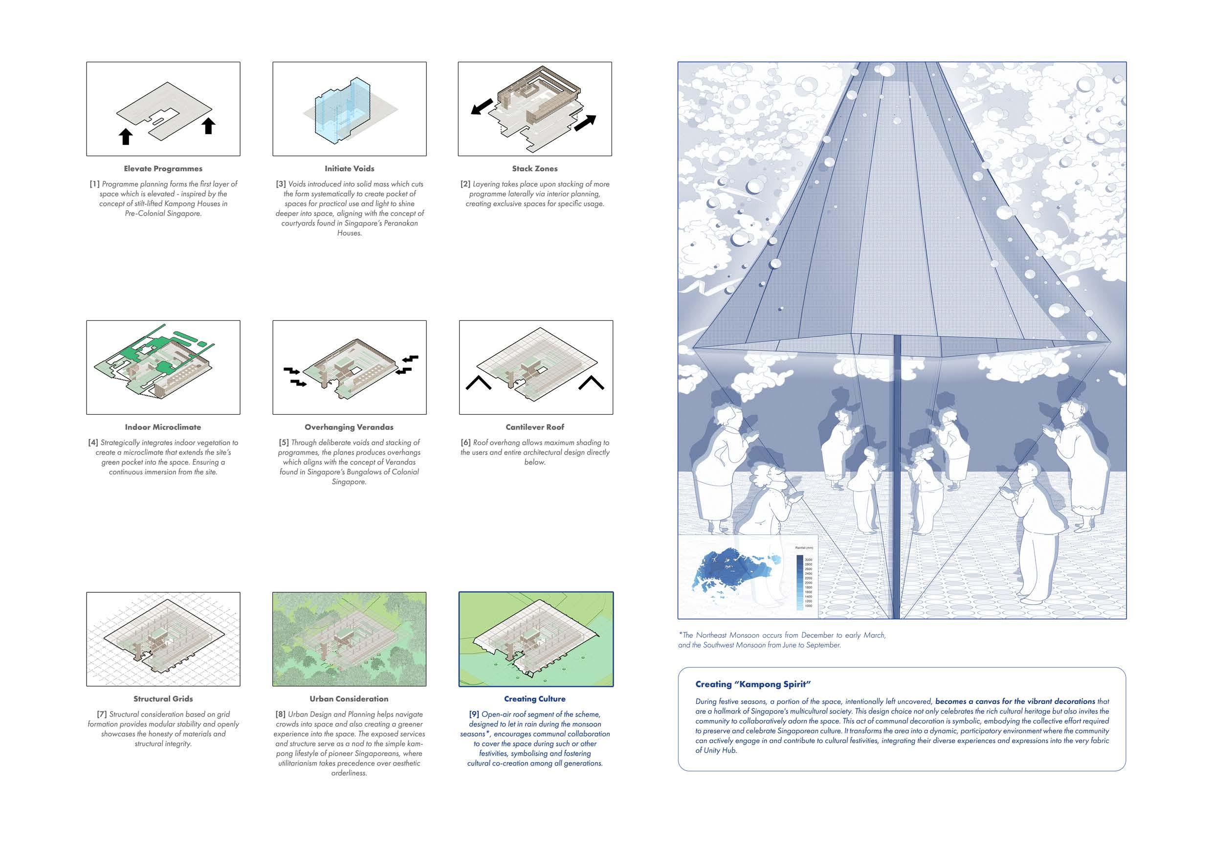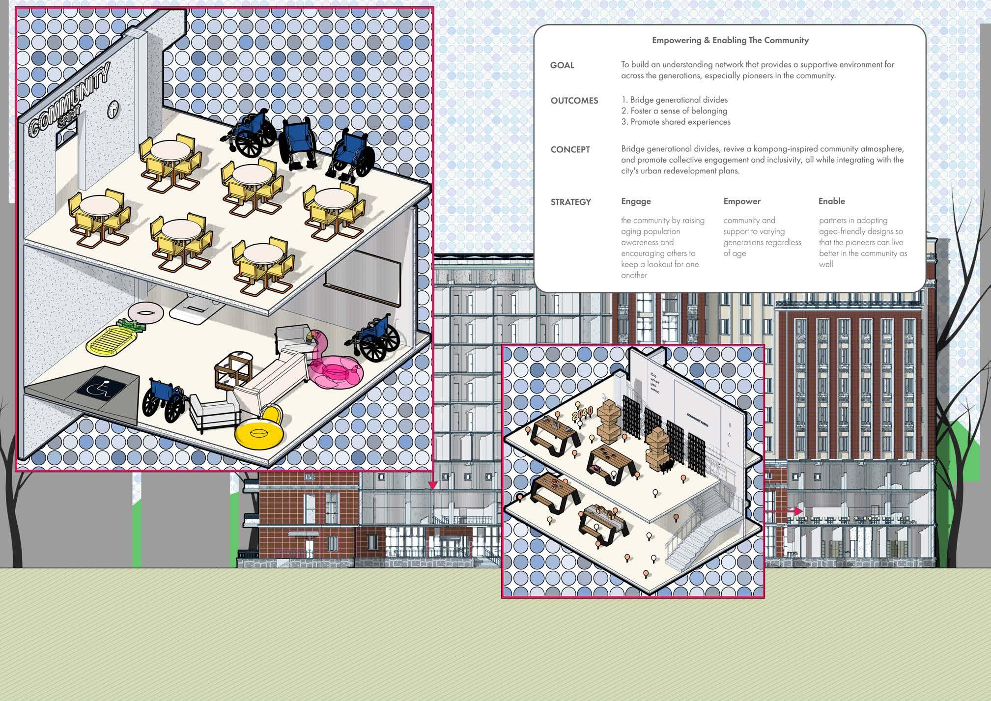 More than just a community space, 'Unity Hub' is an active, experiential institution where the environment demonstrates how social activities and multi-age learning can be seamlessly integrated into the urban fabric, thus offering a tangible, dynamic solution to the challenges forced by the pioneers of Singapore. It aims to inspire a holistic approach to community building by encompassing respect for the past, engagement in the present, and planning for a future.