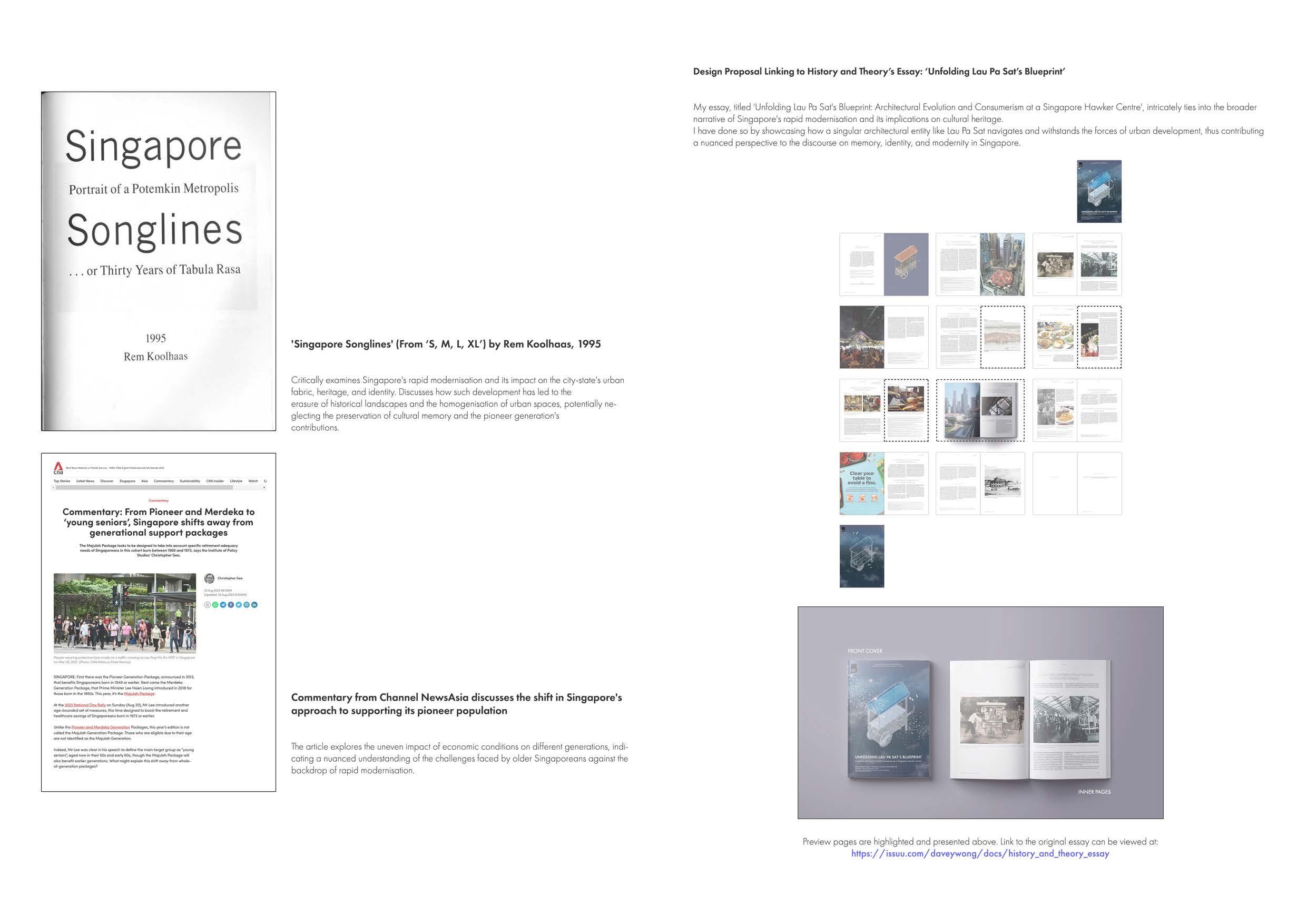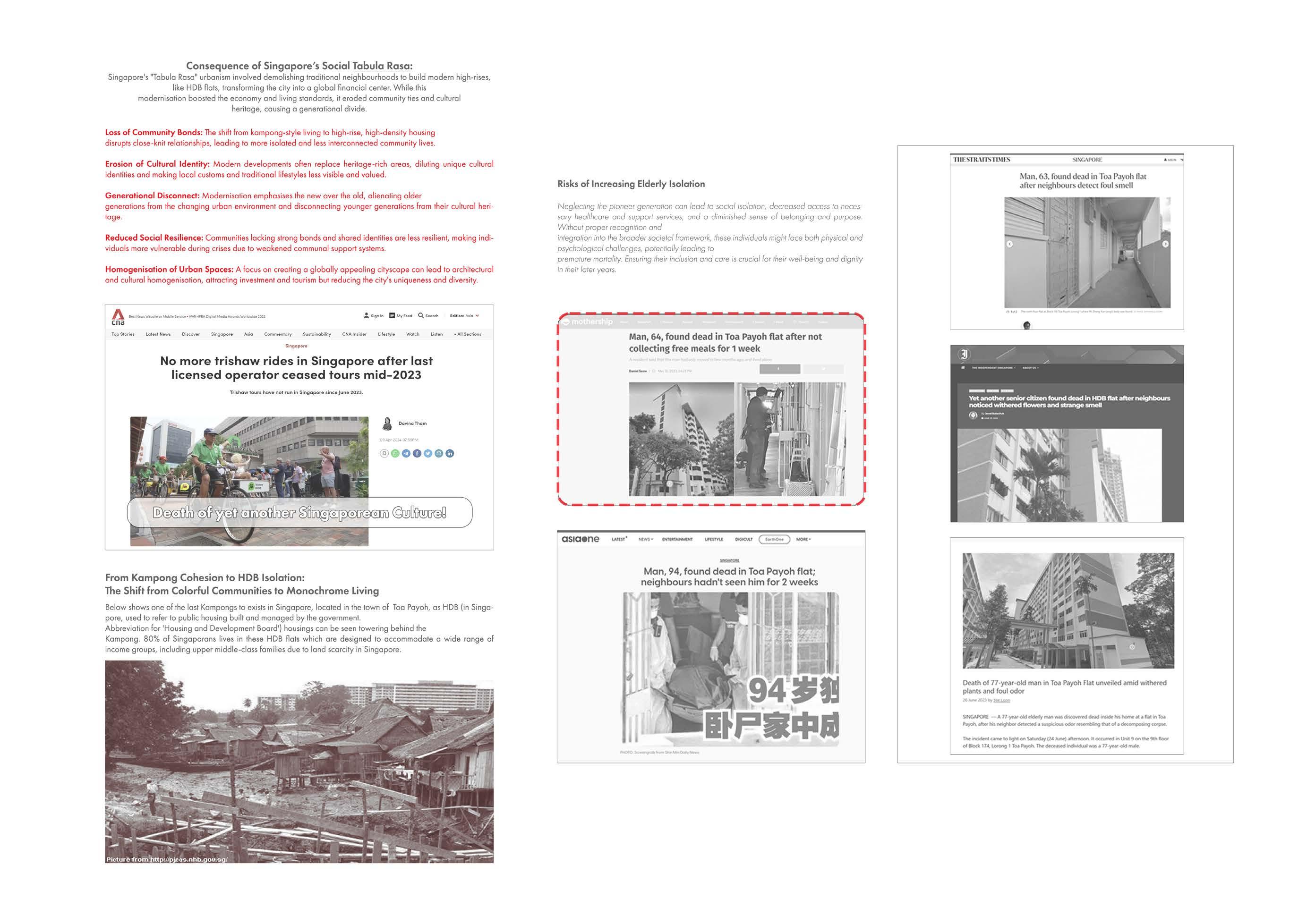 The rapid modernisation of Singapore has led to significant urban and economic development, transforming the cily-state into a global financial hub. While this progress has been beneficial in many ways, it has inadvertently weakened the connection to Singapore's past as old buildings, cultural landmarks, and traditional ways of life are replaced by modern infrastructure and a forward-looking ethos This is a phenomenon that Rem Koolhaas has also explored in The Singapore Songlines' (S, M, L, XL) If reflects on the pioneer generation of Singaporeans who, lo an extent, have been forgotten. The contributions and sacrifices of these early residents, the ones who laid the foundational stones of today's Singapore, are now overshadowed by the focus on current achievements and future aspirations.