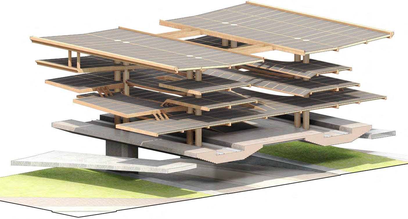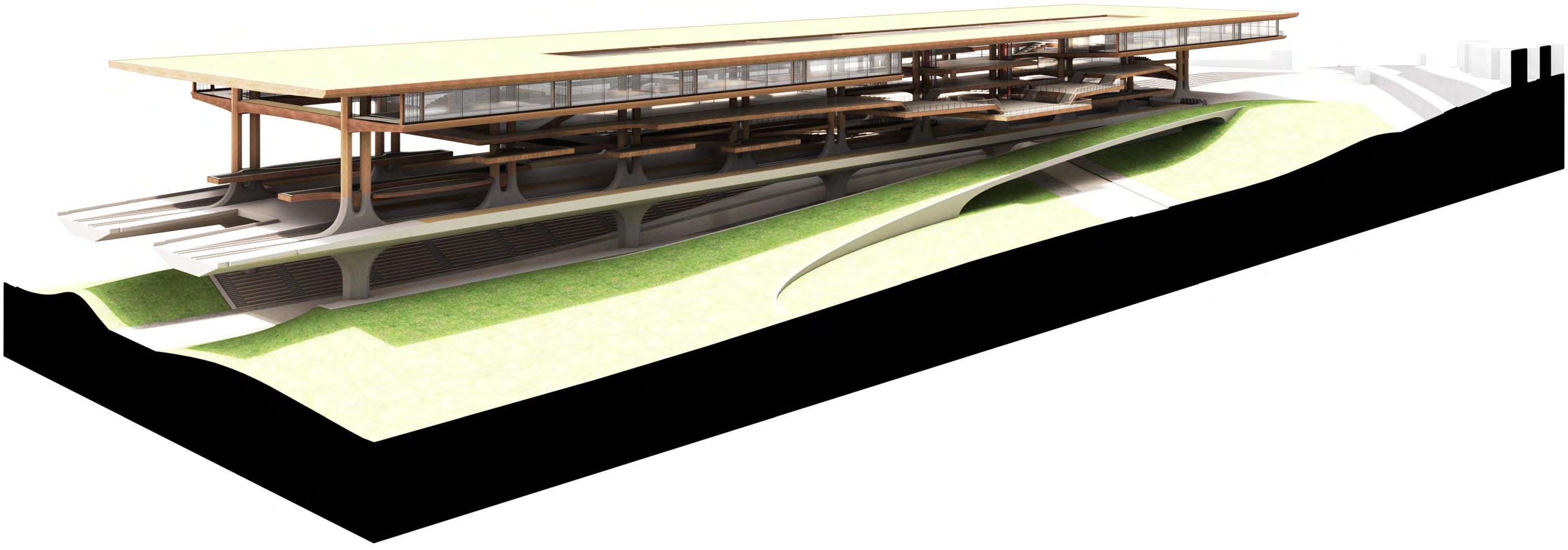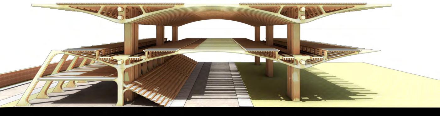 ReinterpretingthestructureofTimberBridge again,ontoalargerscalewheretheexpression ofrepetitionissimplifiedandcondensedto formalargeA-framestructure.