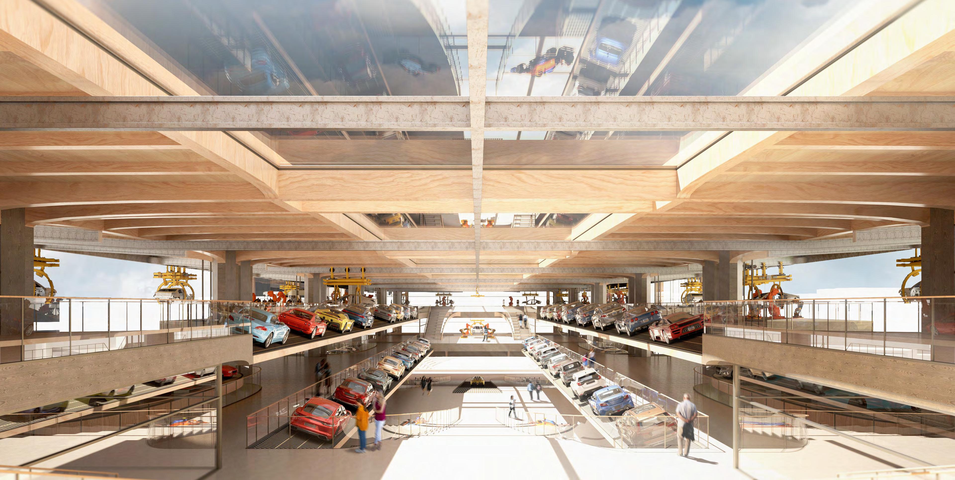 While embodying the symbolic headquarters of British Leyland, as it is compartmentally diversified throughout the city, the building itself is a figurehead of new technologies and practices of the industry. The public journey of the building enables visitors to customise and create their own cars as they become integrated in the manufacturing process, while exploring British Leyland’s heritage and contemporary collections. Constructed from mass timber glulam and CLT, the structure reflects both the contrast of nature and machinery, while also demonstrating the shift towards an environmentally conscious industry. The building form’s transparencies intend to merge with the site and showcase the industry, as the building becomes an all-encompassing shelter for its multifaceted programmes.