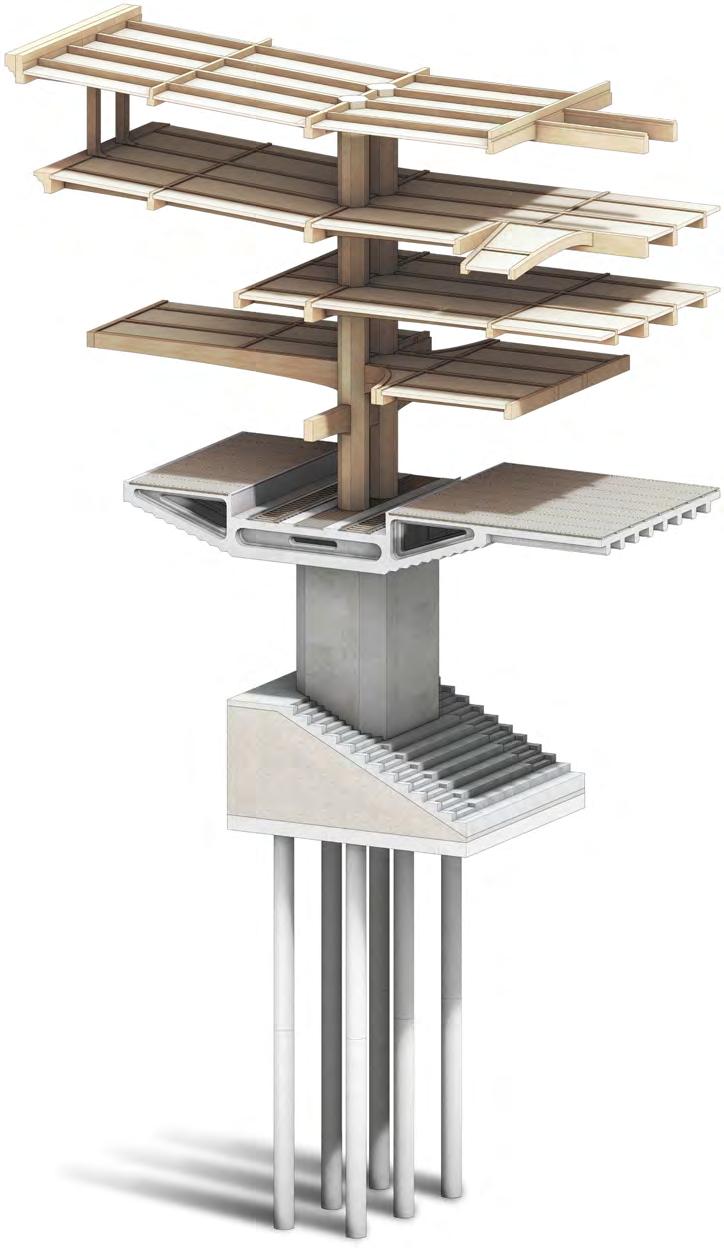 Auniquestructuralsystemcomprisedentirelyof timber,withoutsteeljointsorbraces,eachcolumnis adjoinedtotwoparallelbeamsoneitherside,joined byanovalbeamthatslotsthroughtheseelementsto formarigidjoint.