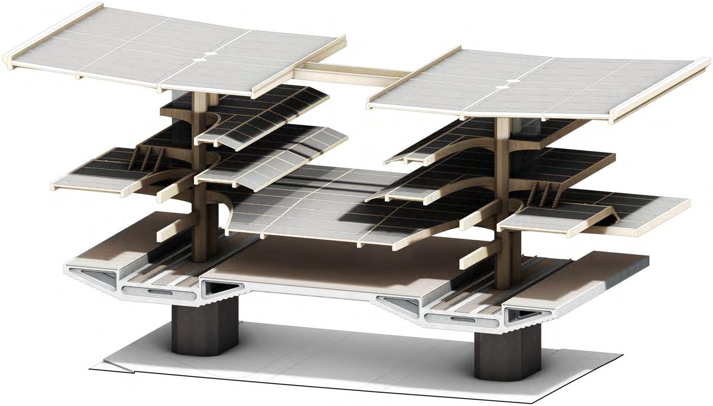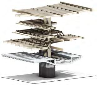 Thebuilding’sstructuralsystemperformssimilarlytothatof anenlargedkitofparts,utilisingrigidjointstoavoidexcess components.Thelargespanningwidthofthebeamsisenabled throughthesmallerendscectionsoftheloadbearingbeams beingsupportedbytwosetsofcolumns,alsoformingasan intermediatespaceforthebuilding.