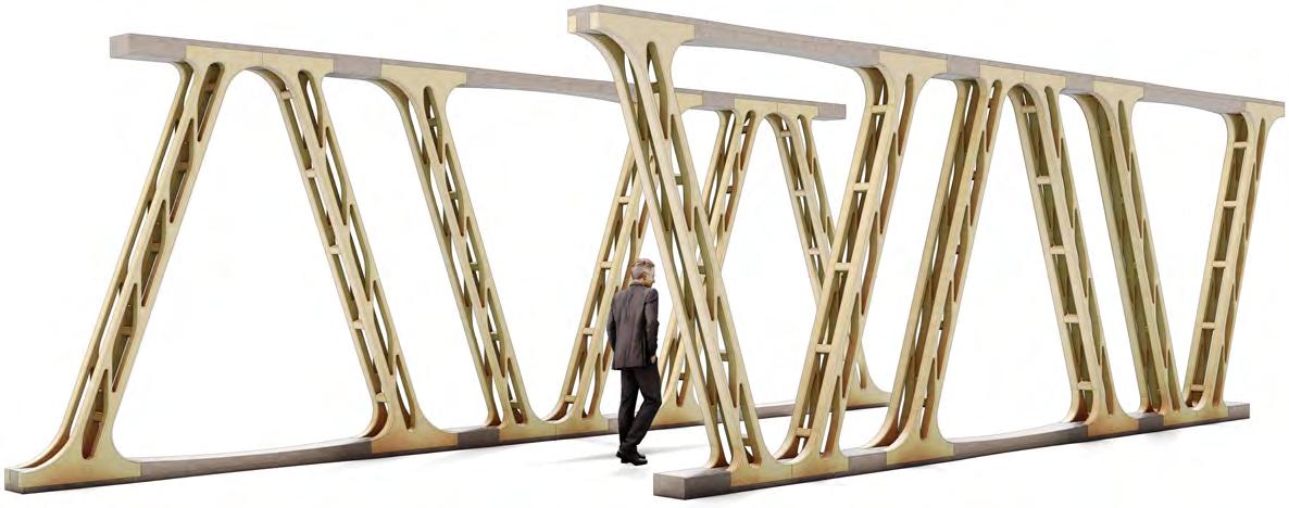 RefiningthetimberA-frameexplored previously,creatingmodularstructural elementsfromprefabricatedsmallertimber compnonents,combinedtoformatruss systemwhenassembledinalinearformtion.