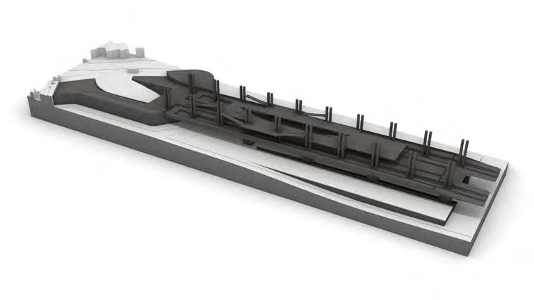 The4marchingstructure,formedbythree parallelbeamsspanning25.2m,enableslevel changesthroughoutthebridge,creatinga centralplatformalongwithplatformsateach end.Theshelteredinteriorspacegivesgreater opportunitytoinhabitthebridge,givinga senseofceremonywhencrossing.