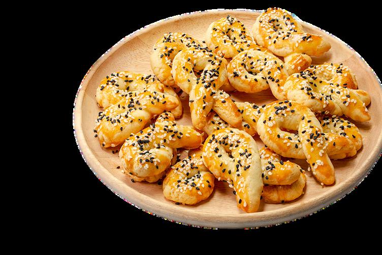 Shape the dough into cookies, balls or little pretzels. Garlish them with the egg yolk, the seame and the black sesame.