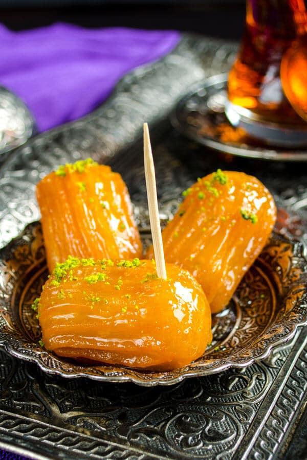 Drizzle a generous amount of melted butter over the top of the sweet and spray with some water.