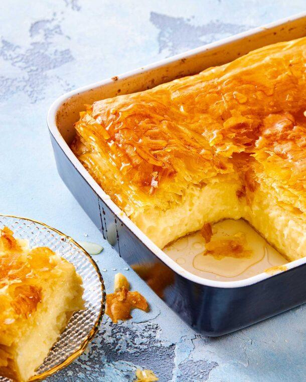 Spread the custard on top and turn in the phyllo that is hanging over the edges. Drizzle with butter. Set 1 sheet of phyllo dough aside and add the remaining sheets over the custard, drizzling each one with melted butter in the same way as before.