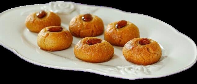 Mix the flour, the powder sugar and the margarine in a bowl. Add the egg after a few minutes and continue mixing. Slowly add the remaining ingredients and knead to a smooth dough. Take lsmall pieces and form then into cookies. Put a garlish in the middle. Put them in the oven with 180* and let them bake for 30 minutes unntil they reach a golden color. For the syrup, put the water and the sugar into a pot and let them boil for 15 minutes. After it has cooled down, put the syrup on the baked cookies and serve them.