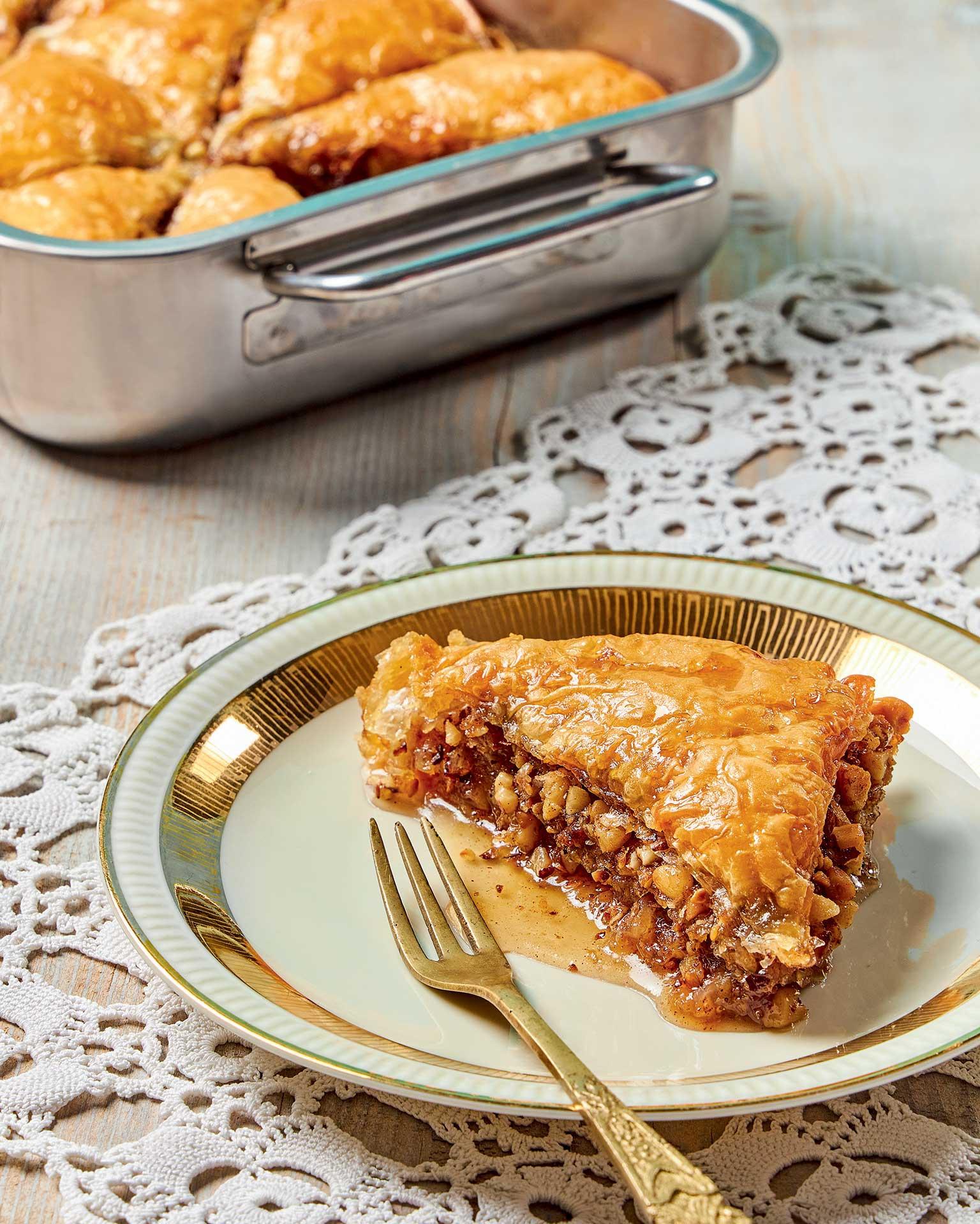 Carefully cover with the final sheet you set aside. Use your pastry brush to help you turn it inwards, towards the bottom of the pan to seal the sweet.