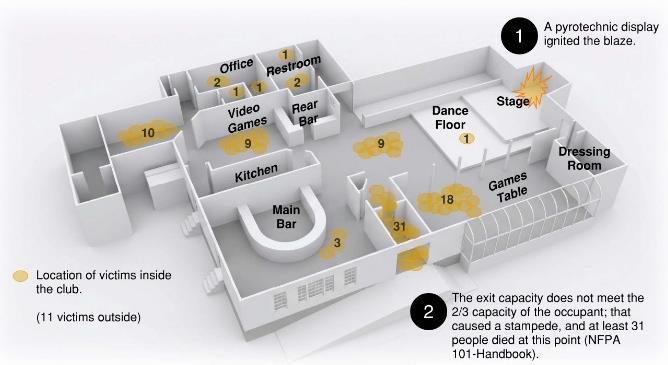 Door Swing: The door swing was a critical factor in the deaths of the patrons, as it opened in the wrong direction, leading to a stampede.