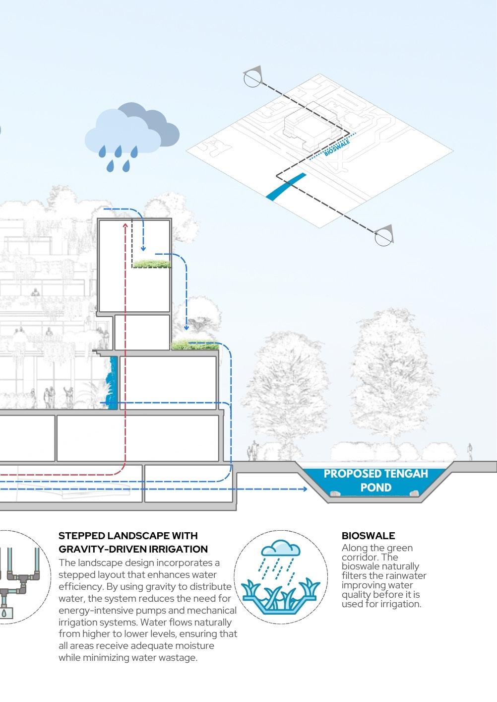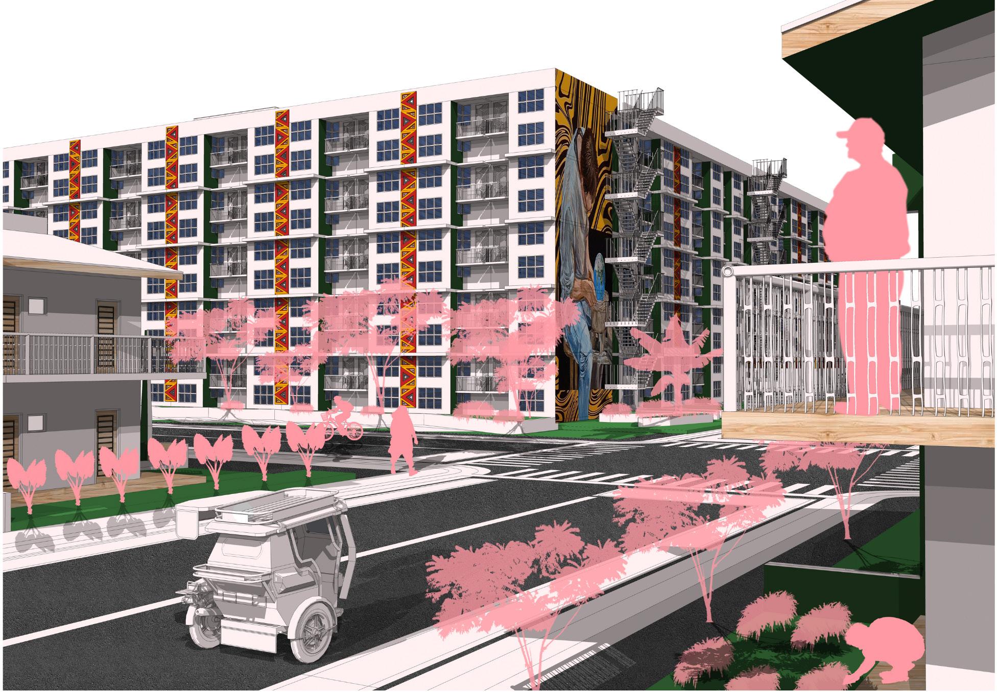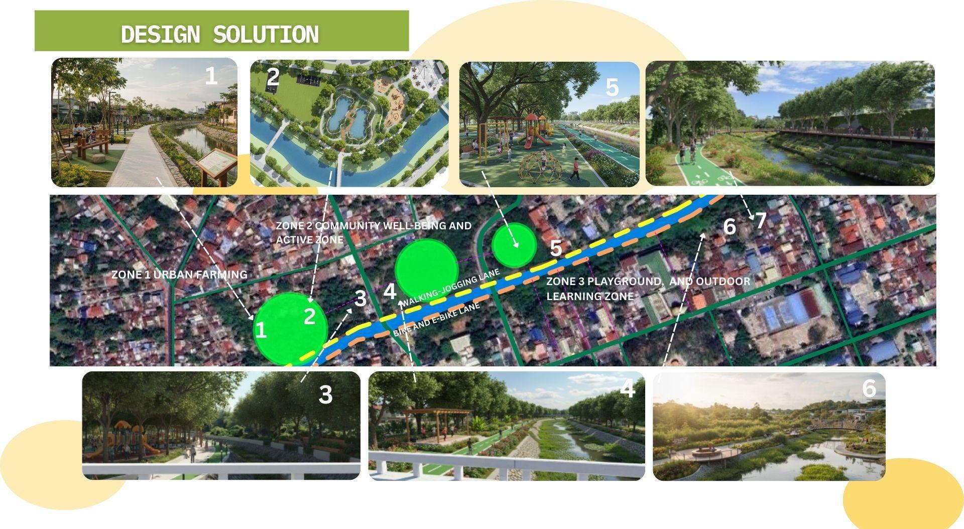 evapotranspiration and shading, thereby reducing building energy demand (SDG 7). Third, the Movescape principle will establish a continuous promenade and dedicated bikeway, transforming the creek into a safe, non-motorized transport and recreation network that connects key areas (SDG 11) and promotes physical activity (SDG 3). Finally, designated programming zones, such as outdoor learning and well-being areas, will encourage active community use and civic engagement, consistent with the Bayanihan mandate for co-management and long-term stewardship (SDG 17).