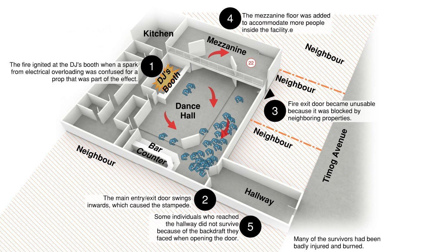 The 3D depiction of the Ozone Disco highlights key areas that contributed to the stampede, which resulted in the deaths of over 100 individuals and injuries to many patrons. Disclaimer: This 3D representation is based on information gathered from available online sources and may not be entirely accurate; however, it serves as a valuable tool for understanding the lessons learned from this tragic event.