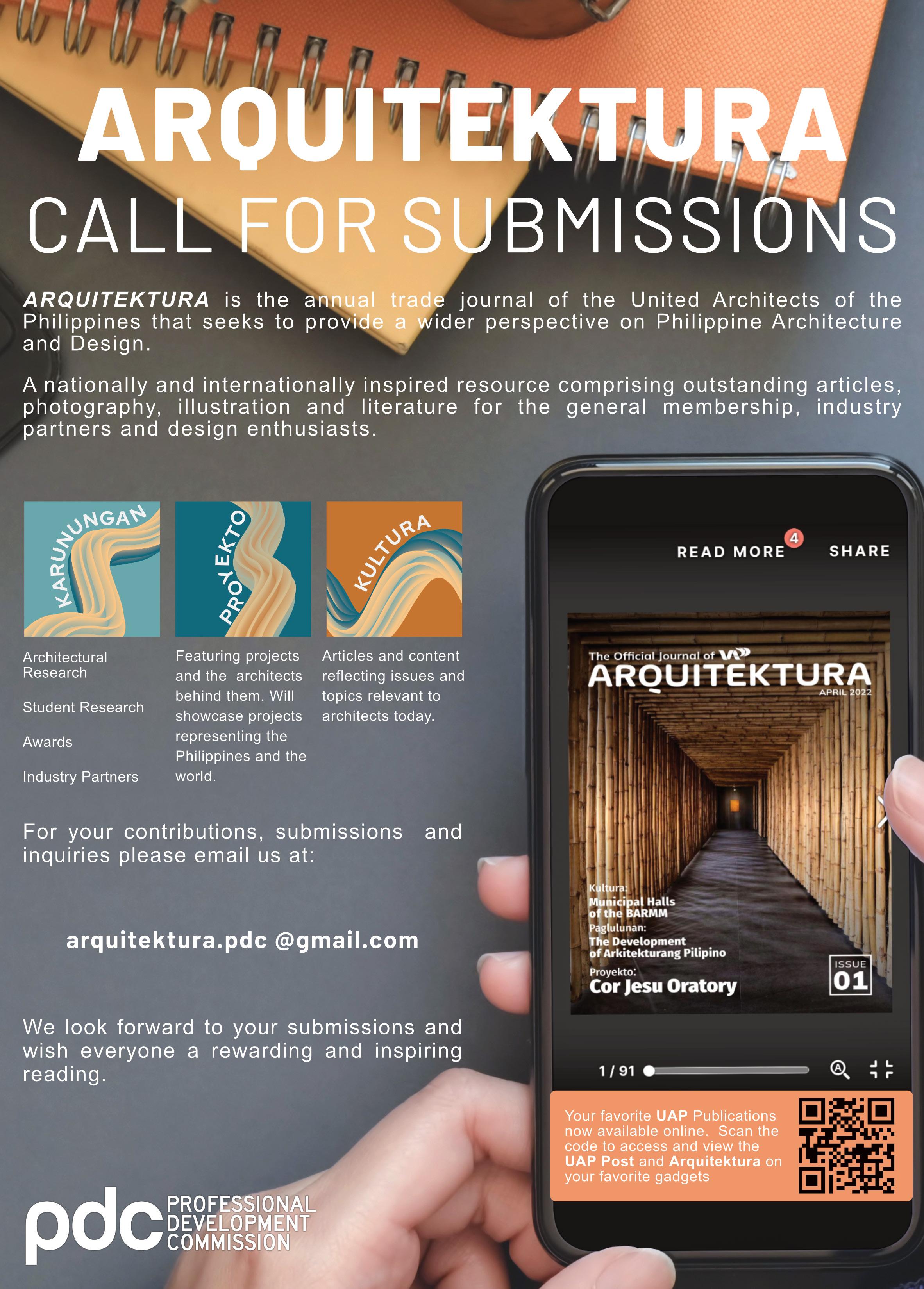 We are also happy to inform everyone that the UAP Professional Development Commission and the Committee on Publications has made the leap to the future by digitizing our beloved publications such as the UAP Post and ARQUITEKTURA. You can now access and read our official publications within the comforts of your own gadgets and implements. Please scan the QR code at the back cover to gain access to our digital collection.