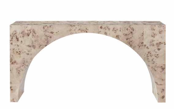 Defined by soft organic curves and waterfall edges, warm sycamore and Madrona burl veneers, white lacquer and textured plaster finishes, with a touch of rose quartz.