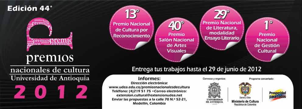 Por otra parte, con los Premios Nacionales de Cultura Universidad de Antioquia el Alma Máter reconoce el oficio de los creadores y gestores de cultura, en sus formas de pensar creativamente y producir conocimiento a lo largo de la vida. Creados en 1979, los Premios llegan a su edición 44 en 2012. Hasta el momento han sido reconocidos 40 creadores en las categorías Premio Nacional de Comunicaciones, Salón Nacional de Artes Visuales, Premio Nacional de Literatura, Premio Nacional de Cultura por Reconocimiento, Premio Nacional de Estudios en Cultura, Premio Nacional de Artes.