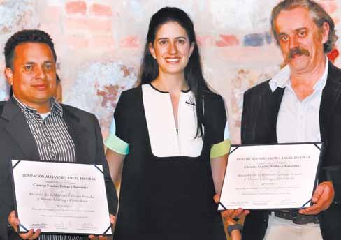 En nuestras universidades sí es posible generar conocimiento relevante para el tratamiento de los grandes problemas de la humanidad, aseguró el rector de la Universidad de Antioquia Alberto Uribe Correa en la ceremonia de entrega de los premios en ciencias y solidaridad de la Fundación Alejandro Ángel Escobar. A su derecha, el egresado de la Facultad de Ciencias Exactas y Naturales John Freddy Pérez Torres, ganador en ciencias exactas, físicas y naturales.