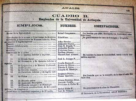 En estas fotografías, tomadas por Danilo Alonso Duque, en la Biblioteca Central, consta la presencia de Rafael Uribe Uribe en la lista de profesores de la Universidad de Antioquia en 1881, siendo rector encargado Don Fidel Cano.