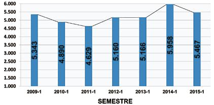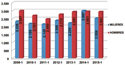 En cuanto al género, puede mostrarse lo siguiente en los últimos años, que evidencia una tendencia favorable en el ingreso de las mujeres, aunque para 2015-1 el porcentaje de inscritas haya sido mucho mayor: 57% frente al 43% de hombres: