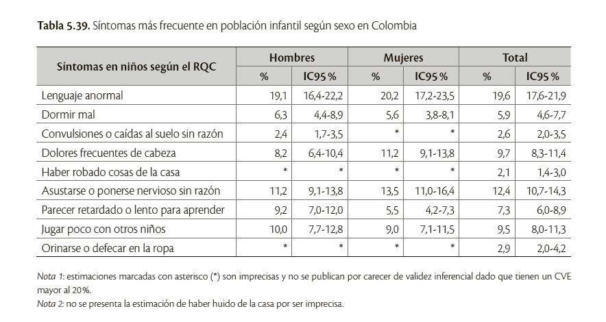 Según el estudio, los síntomas más frecuentes reportados por las madres en los menores fueron: lenguaje anormal 19.6%, asustarse o ponerse nervioso sin razón 12,4%, presentar cefaleas frecuentes 9.7% y jugar poco con otros niños 9.5%. Los dolores de cabeza fueron más frecuentes en niñas que niños (11,2% vs. 8,2%) y se describió un 2,9% de la población infantil con convulsiones o caídas al suelo sin razón, que podrían sugerir trastornos de tipo convulsivo o epiléptico. (Tabla 1).
