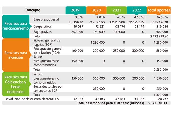 de la educación superior pública. También el Gobierno nacional hizo un enorme trabajo, teniendo en cuenta la situación fiscal del país, con un presupuesto ya en déficit y aun así incrementar los presupuestos. La Universidad en los cuatro años de gobierno del presidente Duque, tendría entre 140 000 y 148 000 millones de pesos adicionales de base presupuestal, comparado con el 2018.