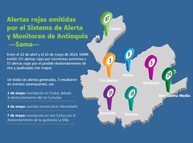 Dentro del monitoreo continuo y la operación de Sama, entre el 22 de abril y el 20 de mayo de 2024 se emitieron 121 alertas rojas por tormentas extremas y 57 alertas rojas por el posible desbordamiento de ríos y quebradas (véanse detalles subregionales en el gráfico). De estas, 2 resultaron en inundaciones en Turbo y San Carlos, y una desencadenó en una avenida torrencial en Montebello. La alerta temprana que se realizó desde Sama a las comunidades y Consejos Municipales de Gestión del Riesgo de Desastres —CMGRD— les permitió activar protocolos de actuación que redujeron el riesgo de desastres.