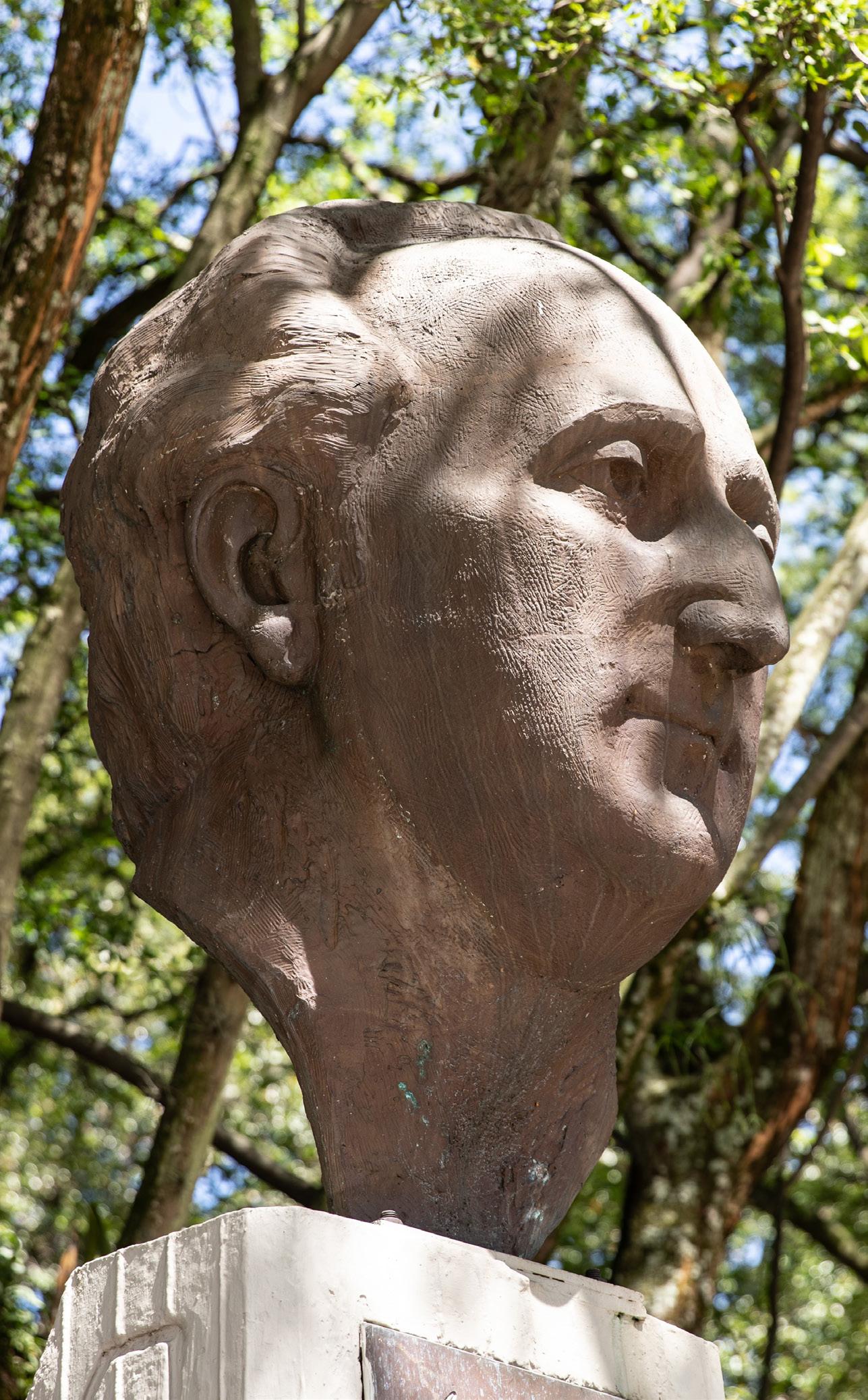 Busto Francisco de Paula Santander. Autor: Bernardo Vieco. Técnica: Bronce. Medidas: 0.80 x 0.69 x 0.69 m. Año de creación: 1939. Categoría: Conmemorativa. Ubicación: Entrada principal Edificio de San Ignacio. Municipio de Medellín