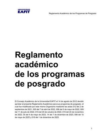 El Consejo Académico de la Universidad EAFIT el 14 de agosto de 2012 decidió aprobar el presente Reglamento Académico para sus programas de posgrado, el cual fue modificado por este mismo Organismo mediante las actas 012 del 2 de septiembre de 2021, 005 del 7 de abril de 2022, 006 del 5 de mayo de 2022, 009 del 11 de julio de 2022, 013 del 20 de octubre de 2022, 015 del 24 de noviembre de 2022, 05 del 4 de mayo de 2023, 14 del 7 de diciembre de 2023, 006 del 15 de mayo de 2025 y 018 del 1 de diciembre de 2025