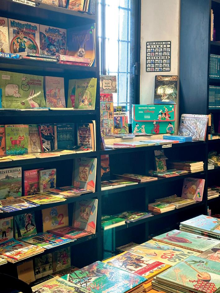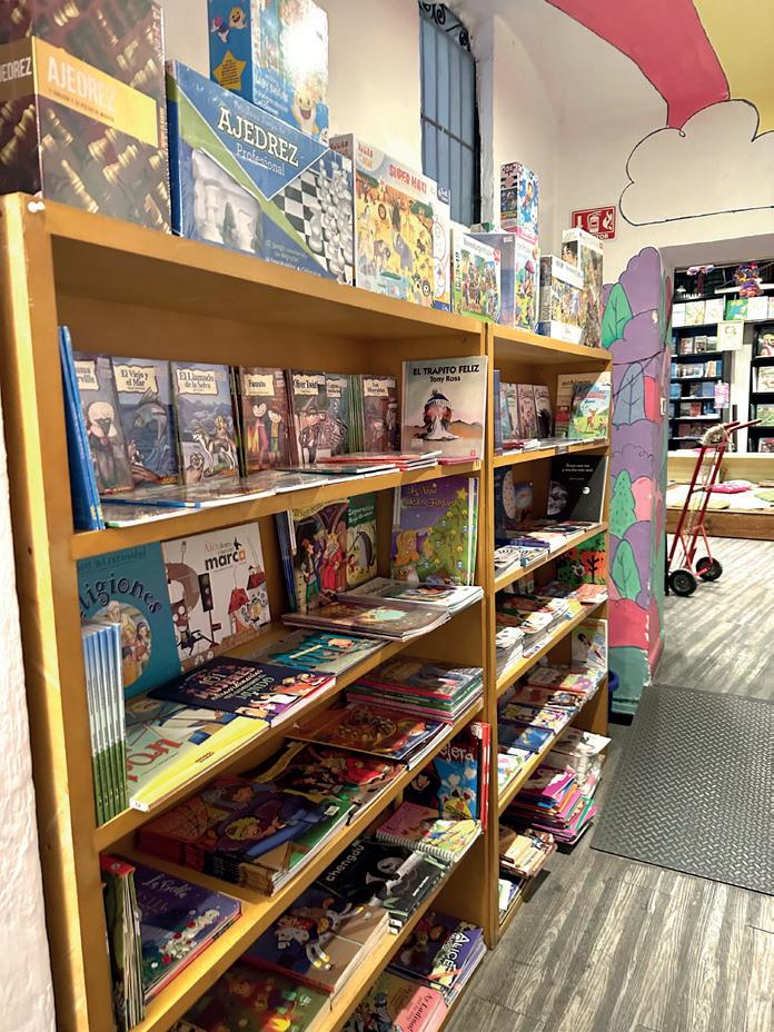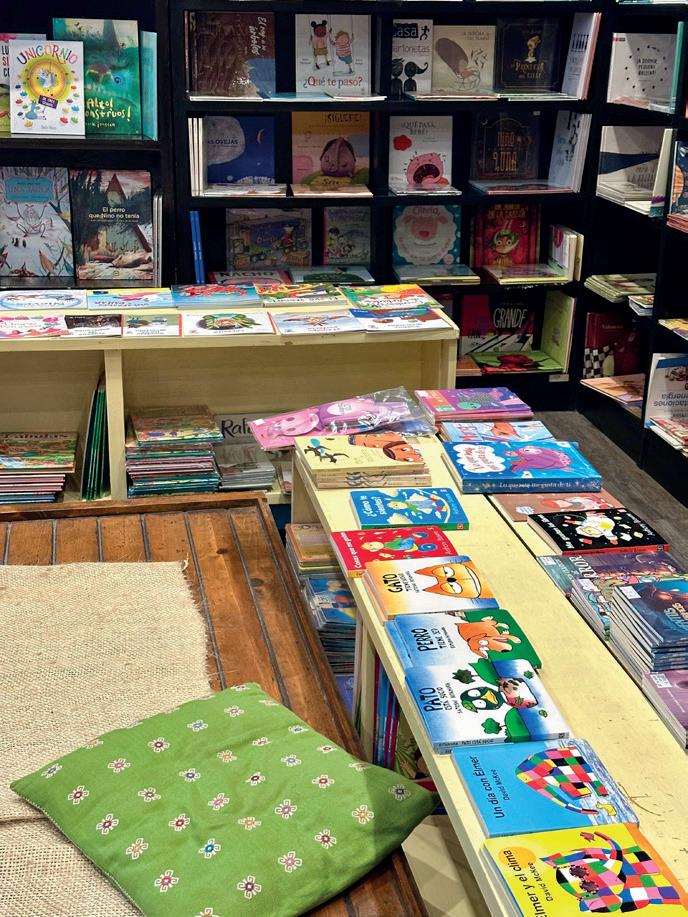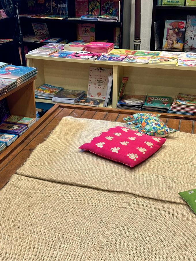 Al centro se encuentra una base de madera con cojines de colores diseñada para que los usuarios, principalmente el público infantil, puedan sentarse a descansar y continuar su búsqueda de lectura con tranquilidad. En ese mismo pasillo hay juegos de mesa de uso libre, lo cual aporta un valor extra a la experiencia dentro de la librería y motiva a permanecer más tiempo