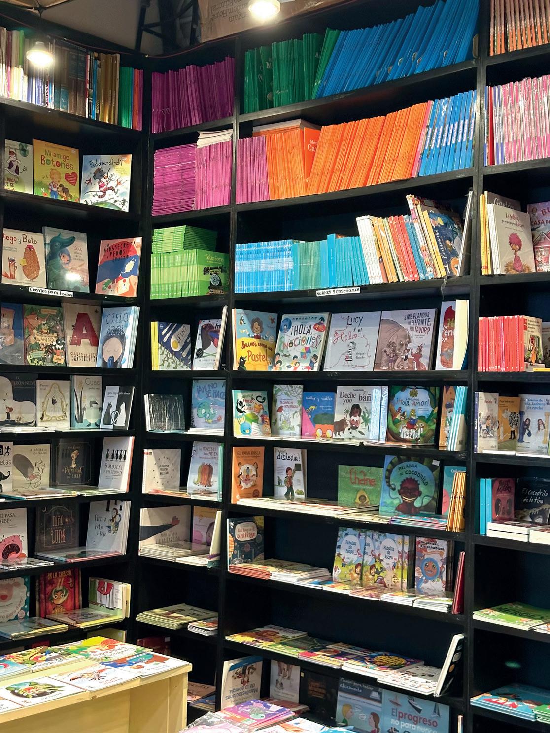en el lugar. El área de descanso está delimitada por muebles que, en la parte superior, muestran títulos frenteados para que las portadas sean visibles. Cada uno tiene el espacio suficiente para que su ejemplar acompañante también pueda destacarse frente a los usuarios de manera clara y atractiva.