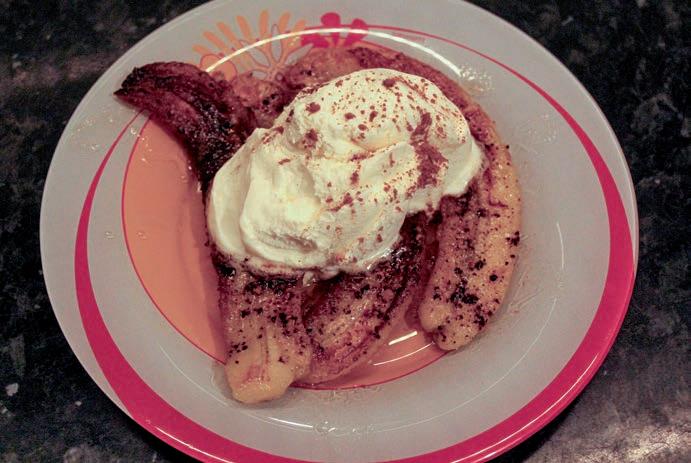 6. Gatavos banānus noņem no pannas un pasniedz kopā ar saldējumu. Var dekorēt ar šokolādi, svaigām ogām vaiievārījumu.