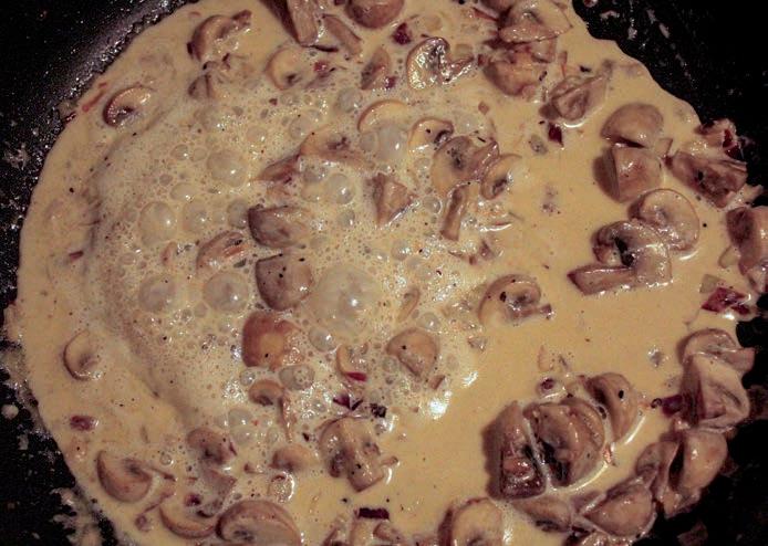 7. Pannā pievieno saldo krējumu, pieber sāli un piparus, kā arī citas garšvielas pēc savām vēlmēm, visu samaisa.