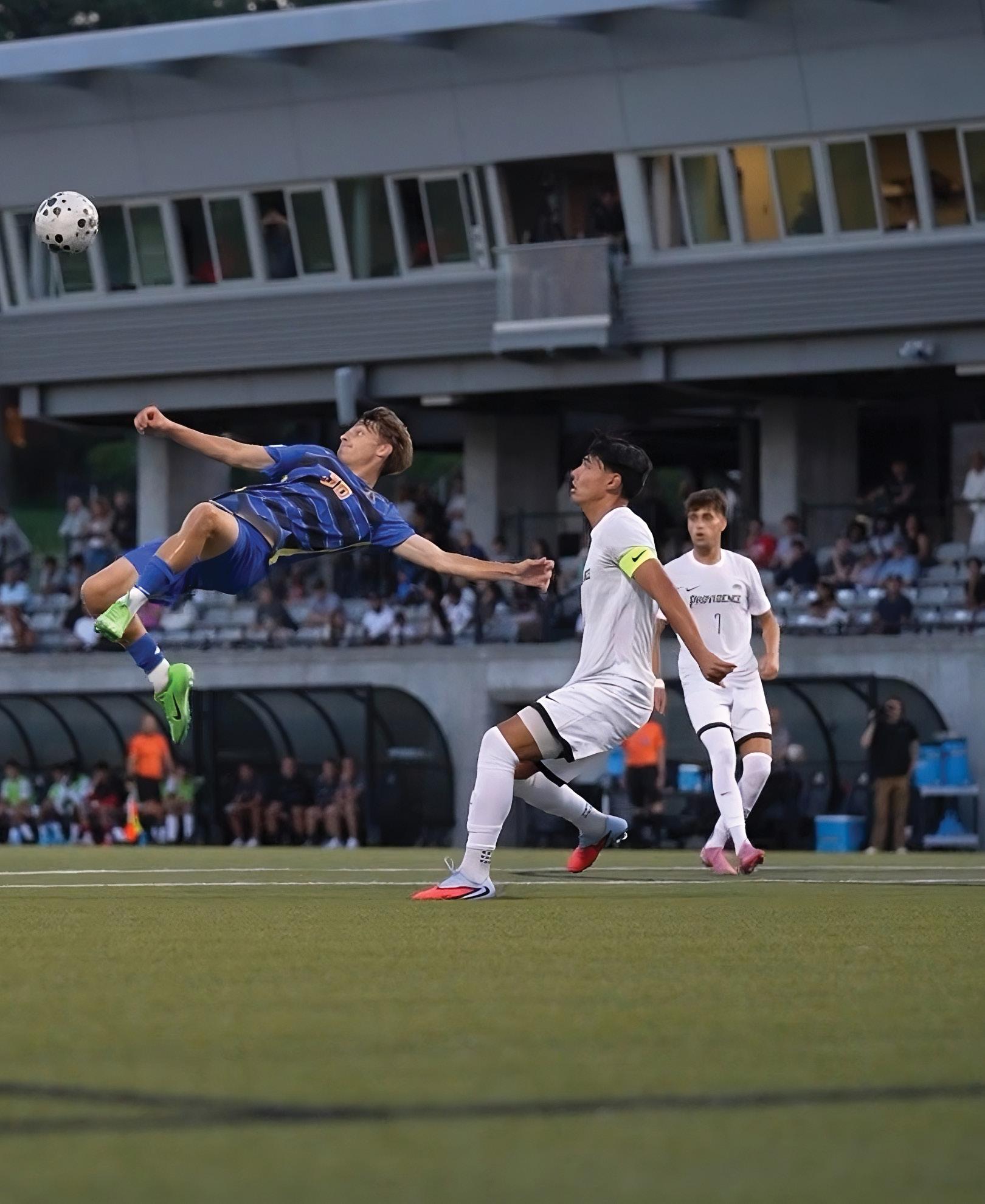 University of New Haven men's soccer player Lukian Lawro ’27 scored the No. 1 play on ESPN's SportsCenter Top 10 on Aug. 25, 2025, with a spectacular bicycle kick against Providence College, securing a 1-0 victory for the Chargers in their inaugural Division I season. The acrobatic goal became a national highlight for the program, garnering over one million views on social media, and was ultimately named Men’s College Goal of the Year by TopDrawerSoccer.com. President Frederiksen invited Lawro and videographer and fellow Charger Connor Deline to meet in his office and commemorate their well-earned celebrity. Brilliant both on the pitch and behind the lens!