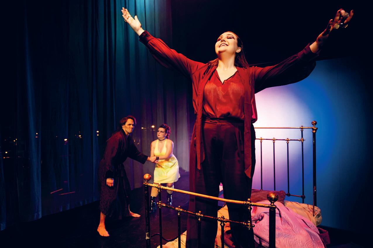 • På sängen står Julia Nylander och i bakgrunden finns Jonas Egfors och Linnea Nordlander.