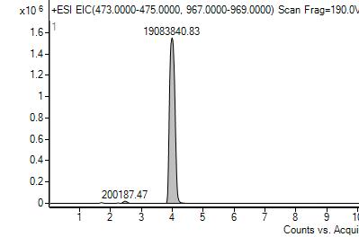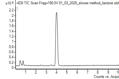 The chromatograms above are typical for wax that was kept in the fridge so there was no reaction with ozone (left) and for wax that was exposed to Redlands ambient air over the summer (right). This comparison demonstrates that the lactone peak is below the quantification limit in the control wax while also demonstrating that the production of lactone from ozone exposure can be detected using LC-MS. The same chromatogram result was shown in Ramirez’ work[16], verifying that we can reproducibly demonstrate that oleanolic acid in plant waxes exposed to ambient air forms lactone.