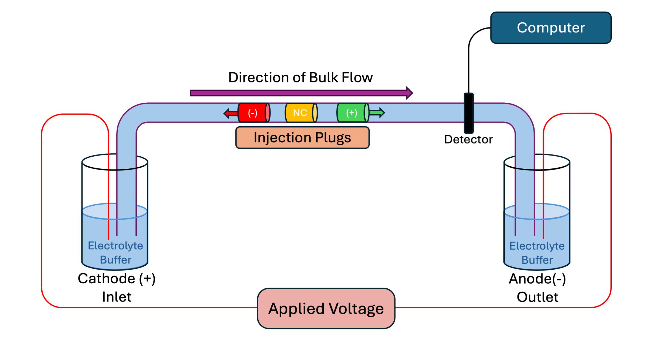During plug-plug mode, the capillary is filled with buffer (purple).Aplug of substrate (blue) is injected, followed by a plug of enzyme (green). The reaction is run electrophoretically, allowing the enzyme plug to mix with the substrate plug to facilitate the reaction. Enzyme, product, and unreacted substrate plugs are separated via traditional capillary electrophoresis before reaching the end of the capillary to be characterized. Plug-plug uses less substrate than long-contact mode, making it appealing to researchers. Acknowledgements