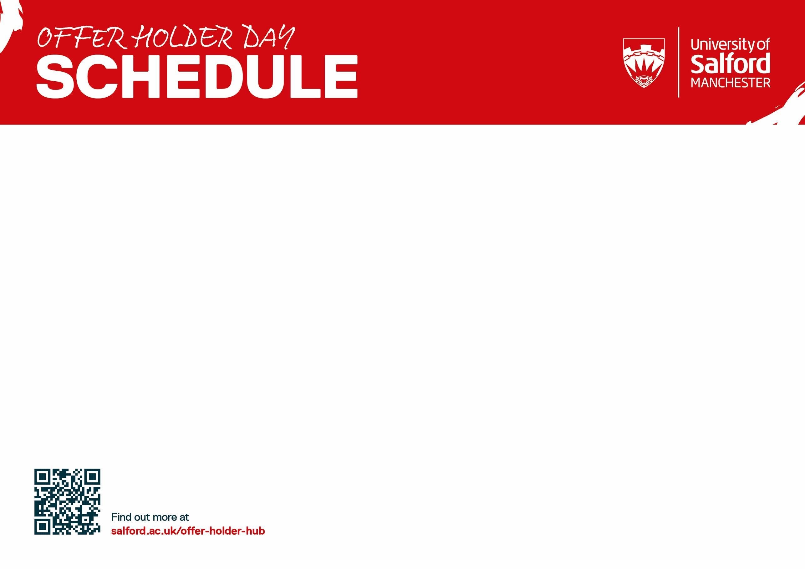 Thank you for joining us for your Offer Holder Day. We hope that the day will give you a flavour of what life is like as an undergraduate student here at the University of Salford and that it answers any questions you might have. Please find below an overview of what’s happening on the day.