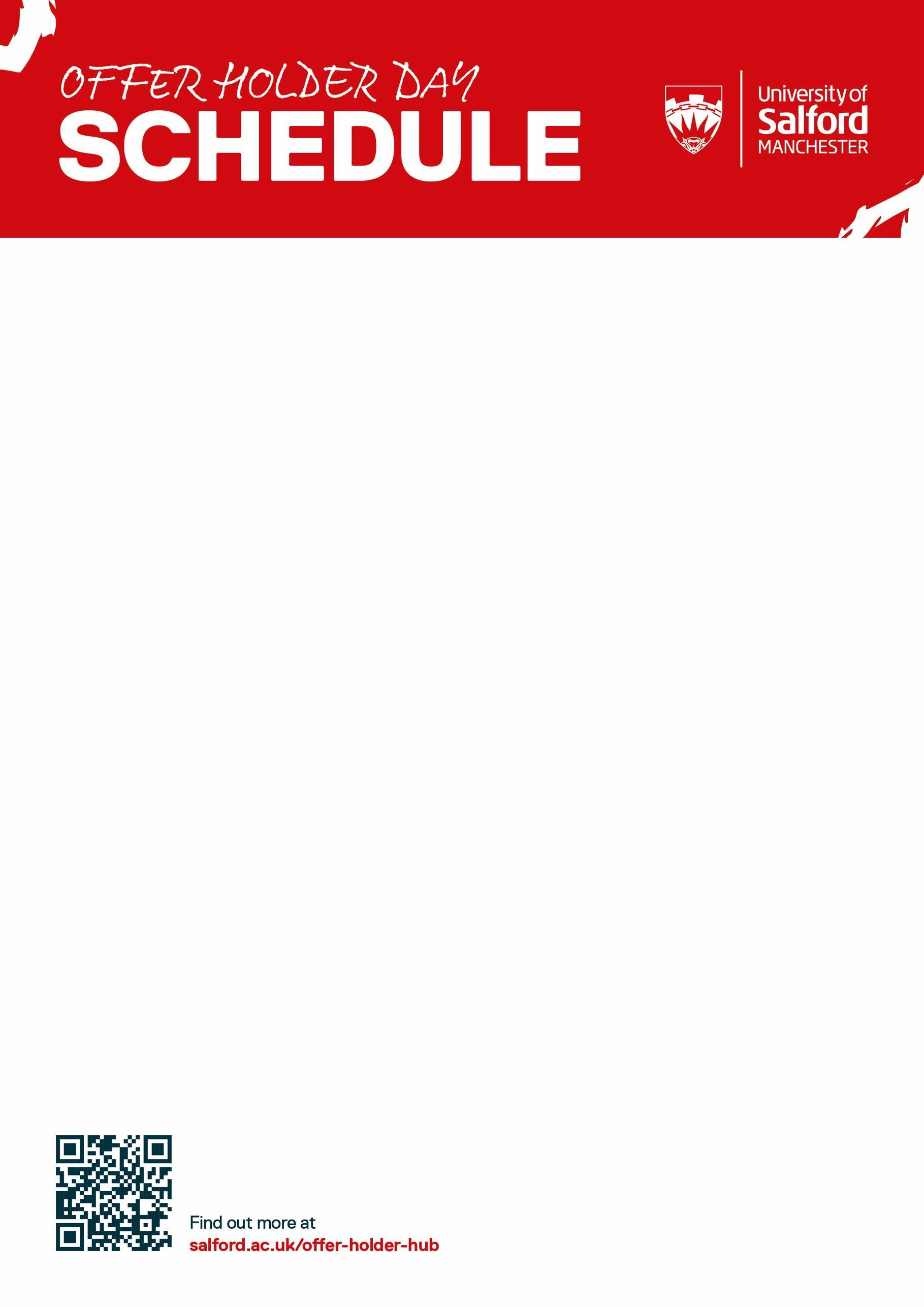 Thank you for joining us today for your Offer Holder Day. We hope that today will give you a flavour of what life is like as an undergraduate student here at the University of Salford and that it answers any questions you might have. Please find below an overview of what’s happening today. If you have any questions, please have a chat with any of the team at the check-in desk or information point. Our friendly student ambassadors are also happy to help.