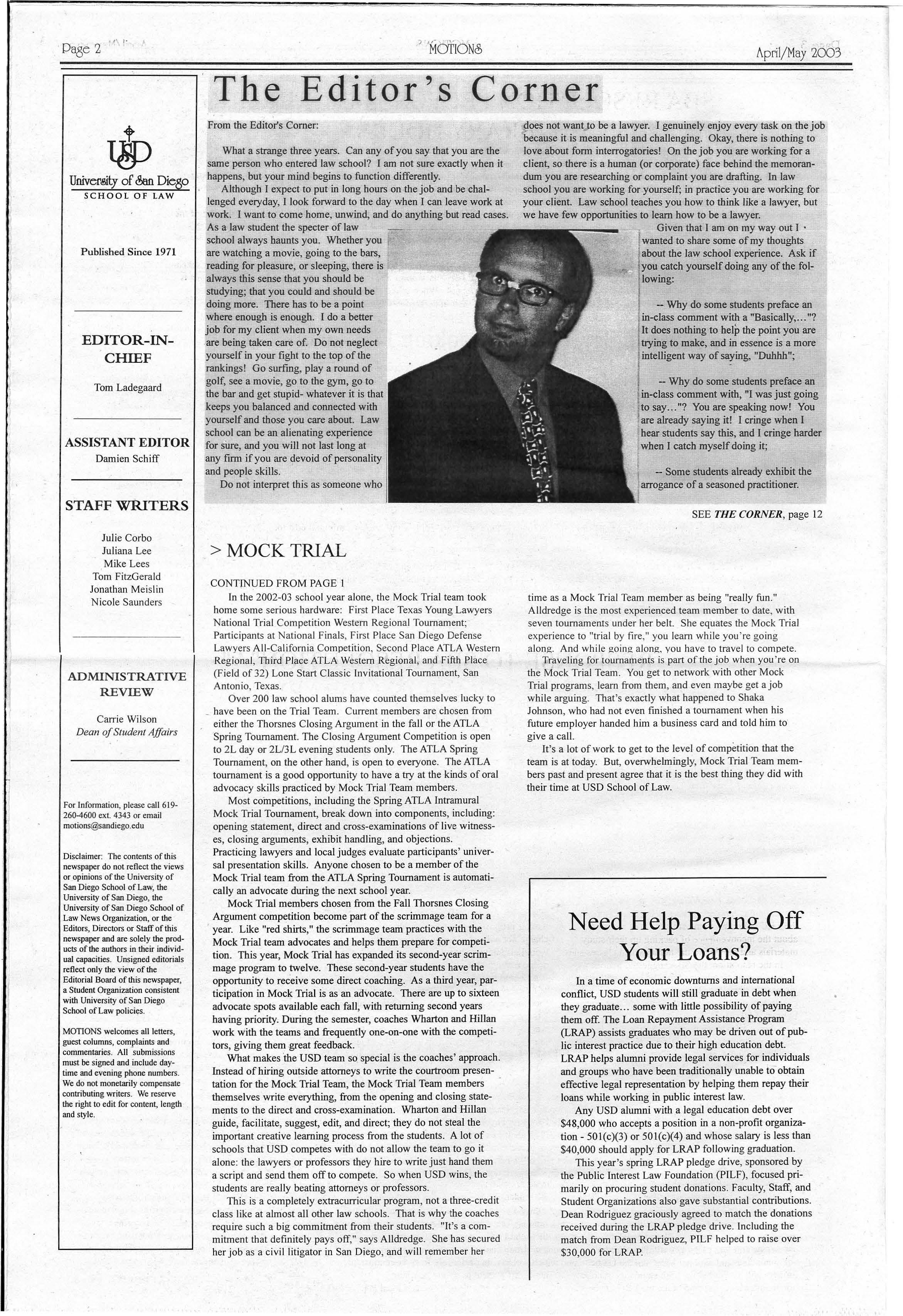 Thi s is my last issue of Motions as E ditor- in-C hi ef, and n ext ye ar the tra dition will be passe d on to a Mr. Damien Schiff, a nd able- mind ed individual who wi ll not di s appoint. I also want ed to publicly thank my hard working s taff writers, whose work is th e essence of th e paper. Working for Motions has been a tremendou s ex perien ce and it is one th at I know I will miss. To anyon e who is looking for a re s ume boost , to improve th e ir writin g skill s, and an opportunity to get plugge d in to th e leg al community, do not hes itat e to appl y.