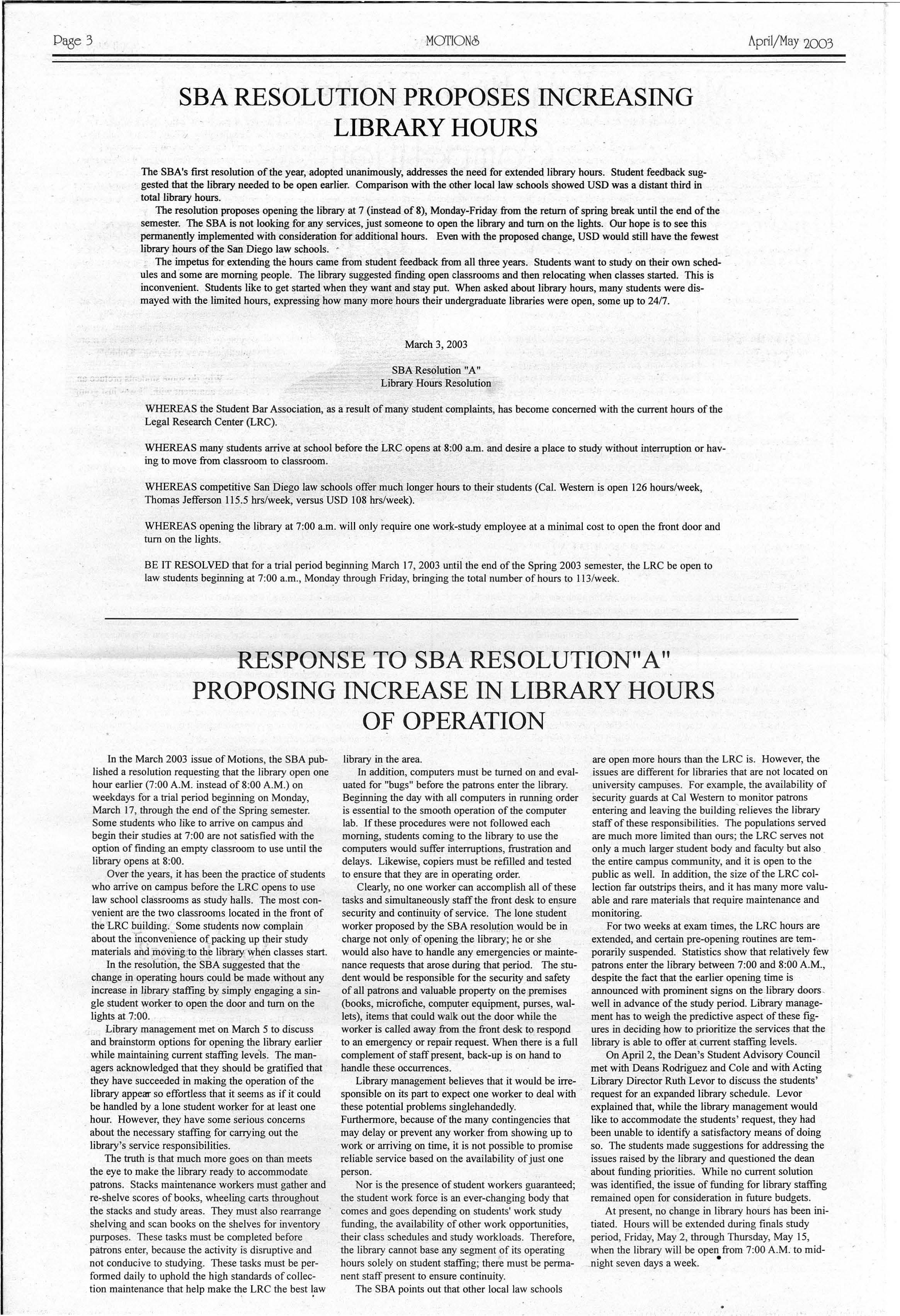 In the March 2003 iss ue of Motions, the SBA publi shed a resolution requesting that the library open one hour ear lier (7:00 A.M. in stead of 8:00 A.M.) on weekdays for a tria l period beginning on Monday, March 17, through the end of the Spring s emester Some students w ho lik e to arrive on camp us and beg in th eir studies at 7: 00 are not satisfied wjth the option of finding an empty classroom to use until the library o pens at 8:00
