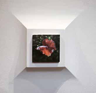 On the beige wall parallel to the banister at the main entrance of Washington House, Francisco Sierra (*1977) has installed his oil-painted miniatures on wood (7 x 7 cm) of “Betta splendens” or Siamese fighting fish—sick, overbred ornamental fish—on concave niches. The meticulously painted small-scale fish appear created in a style similar to photorealism, but without the use of stencils. Francisco Sierra mounts the paintings on wood, cut out of wine boxes, on convex wall reliefs, further enhancing their dimensionality. This miniature aquarium of ornamental tropical fish on tiny wooden pieces challenges the relationship between overbred pets and human intervention in nature, questioning the extent to which humans manipulate and alter life forms.